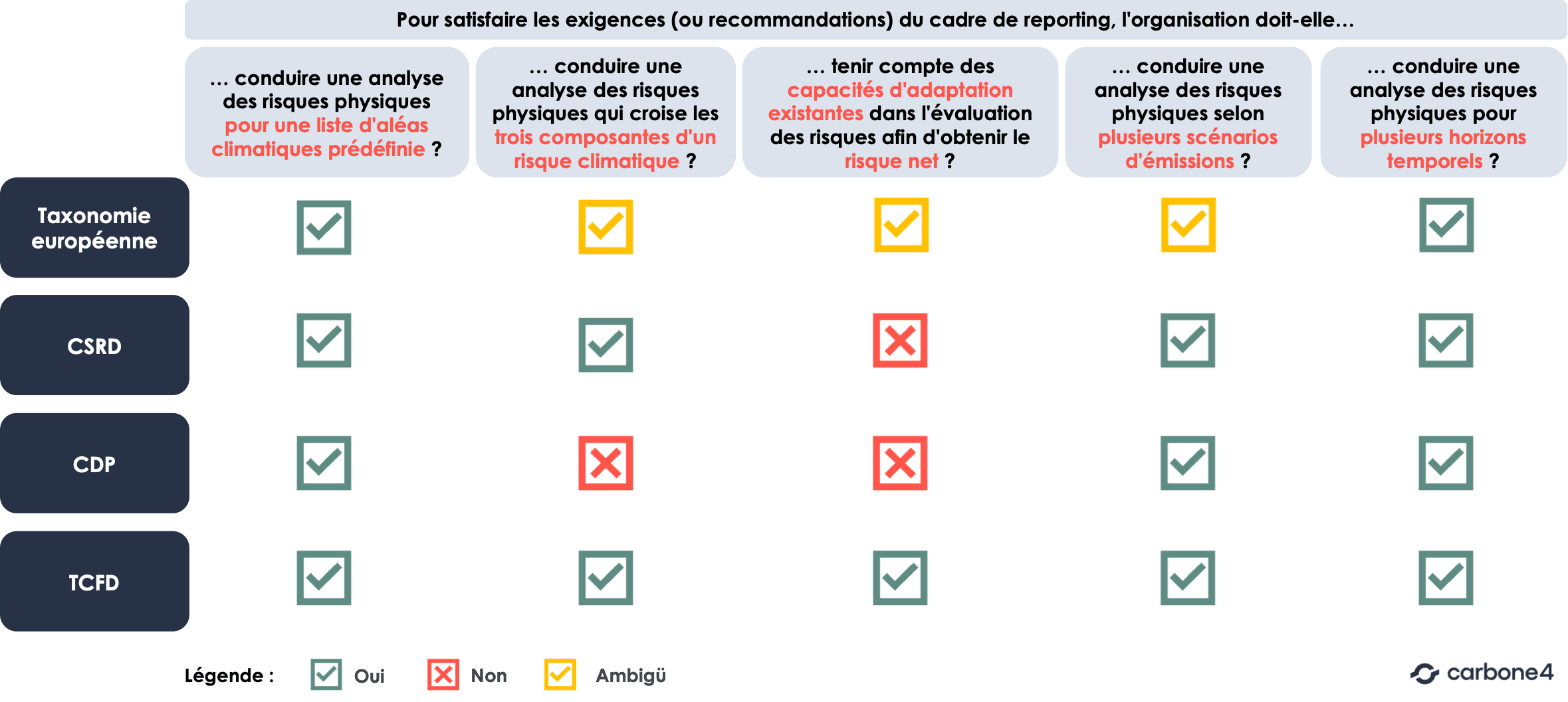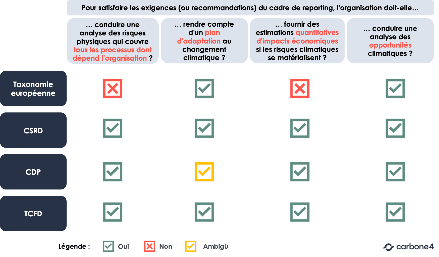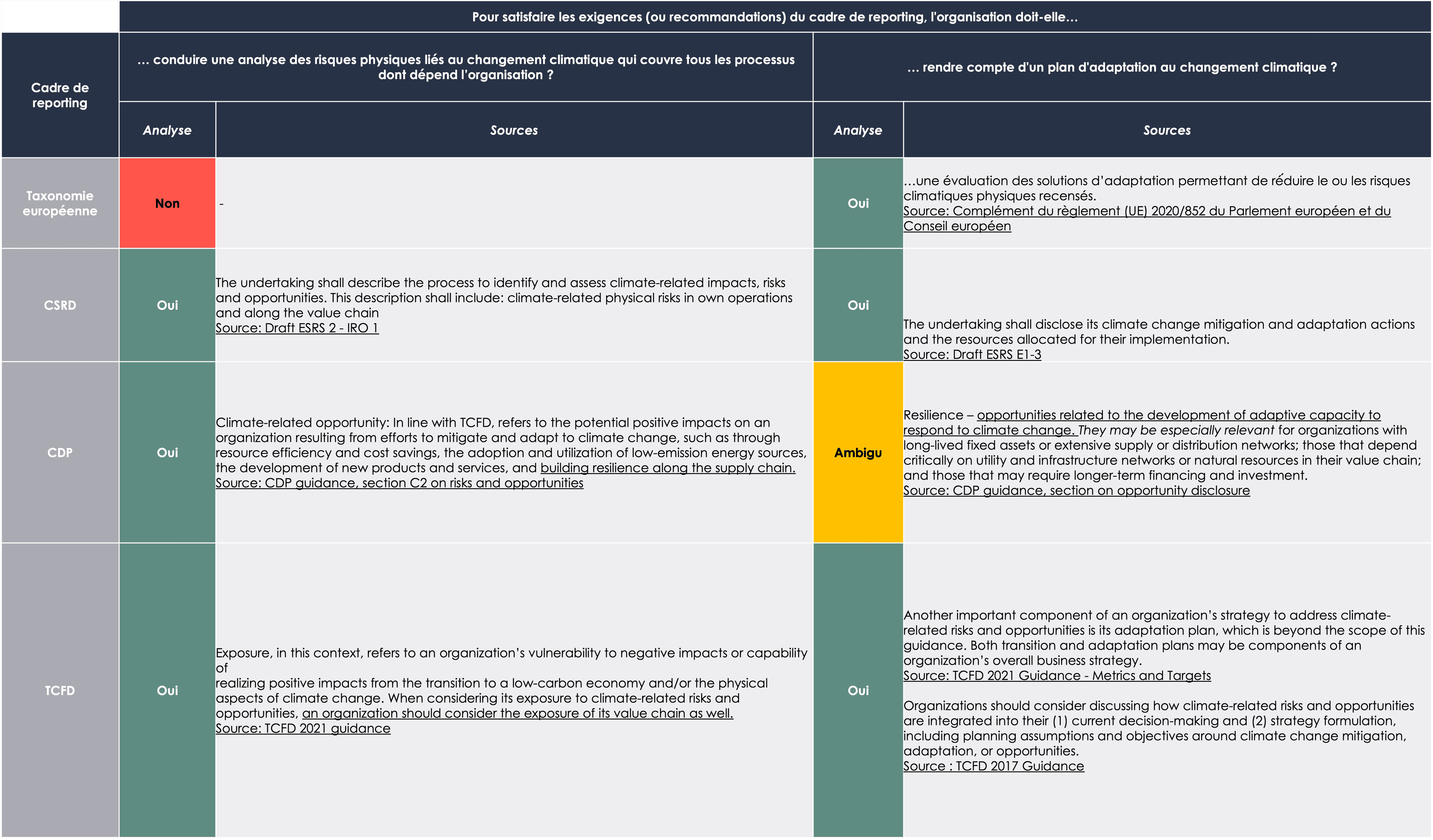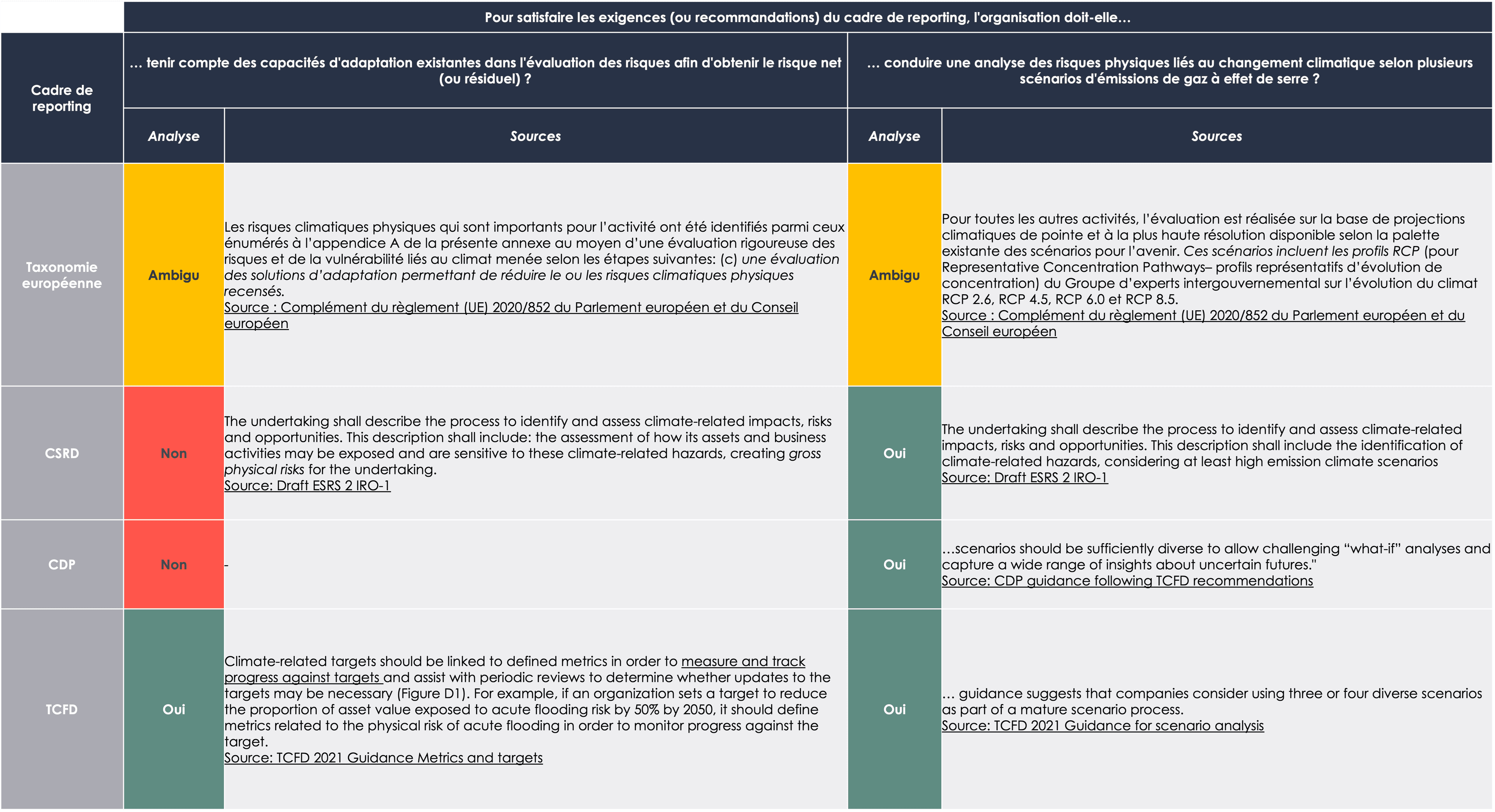 Cela étant, après une analyse détaillée des textes, il ressort que les exigences des cadres de reporting sont globalement alignées et adaptées à la bonne appréhension des risques climatiques. Ce contexte règlementaire est donc favorable pour embarquer les acteurs économiques dans des démarches d’adaptation au changement climatique.