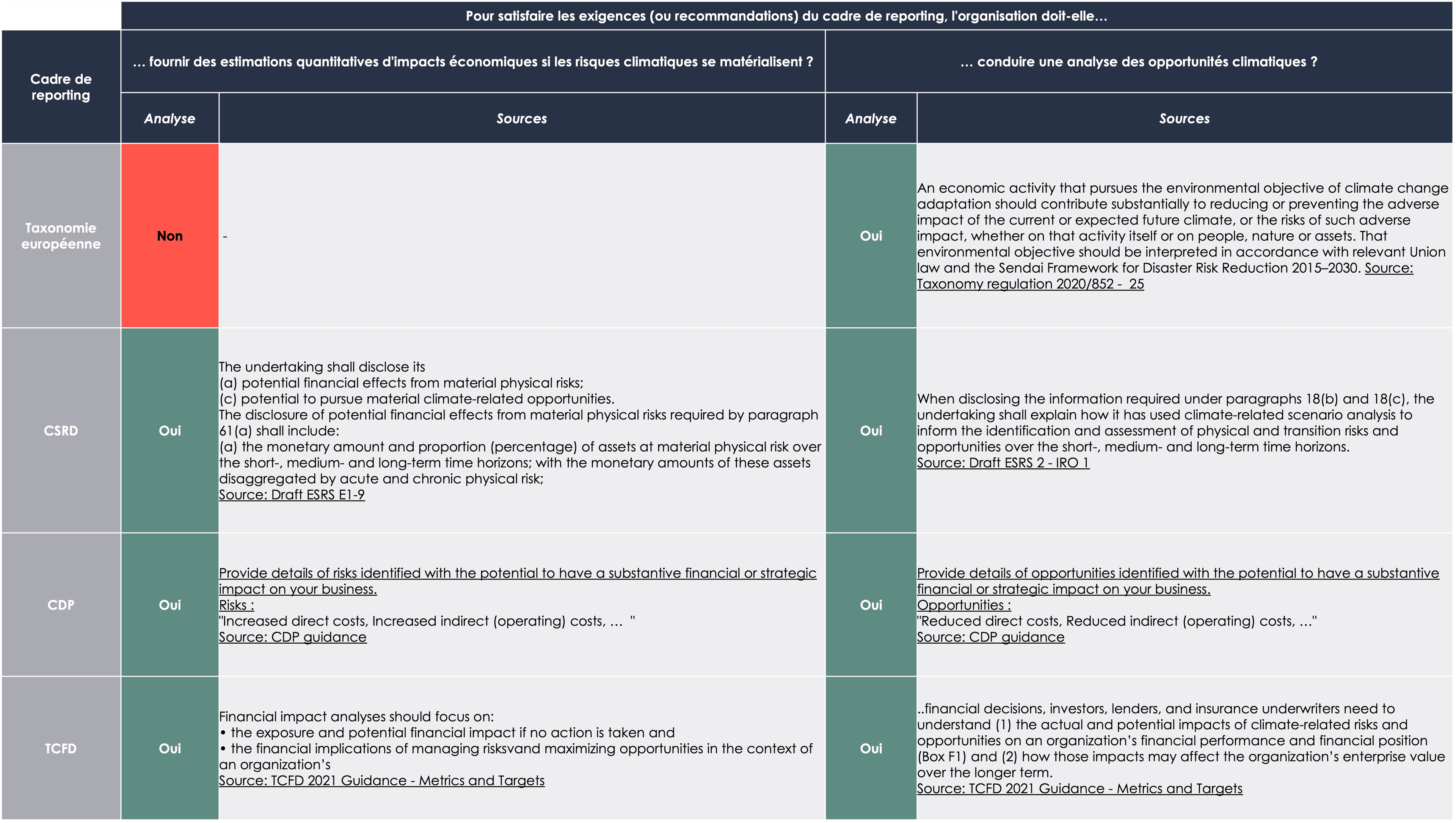 - La taxonomie européenne apparait comme le cadre le moins détaillé et exigeant, car elle ne demande pas de manière explicite d’analyser les risques pour tous les processus dont dépend l’organisation, ni de fournir d’estimations quantitatives d’impacts économiques. De plus, les caractéristiques techniques requises pour certains critères de l’analyse de risque sont ambiguës.