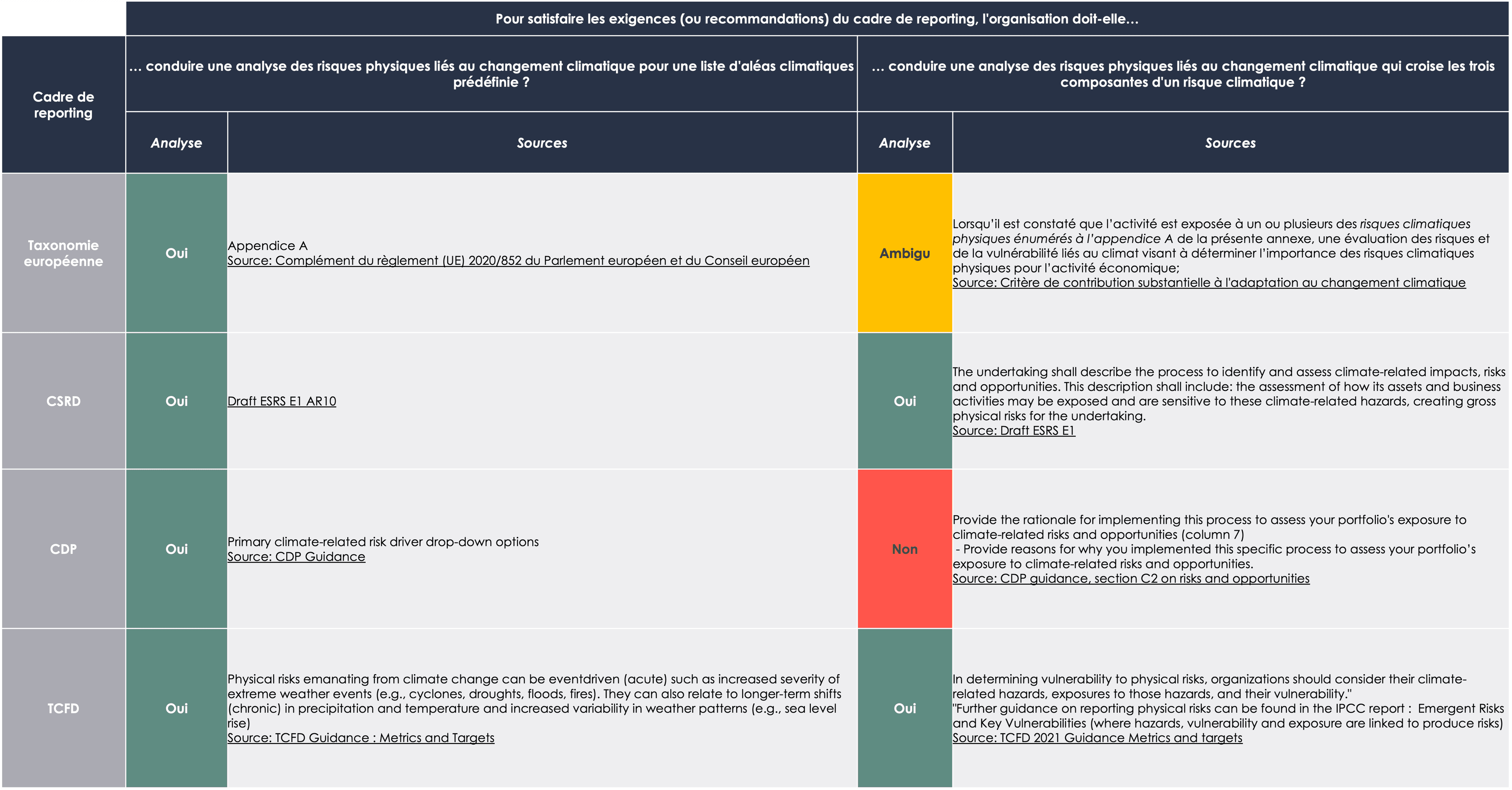 - Le CDP est le seul cadre à ne pas faire mention des trois composantes d’un risque climatique.