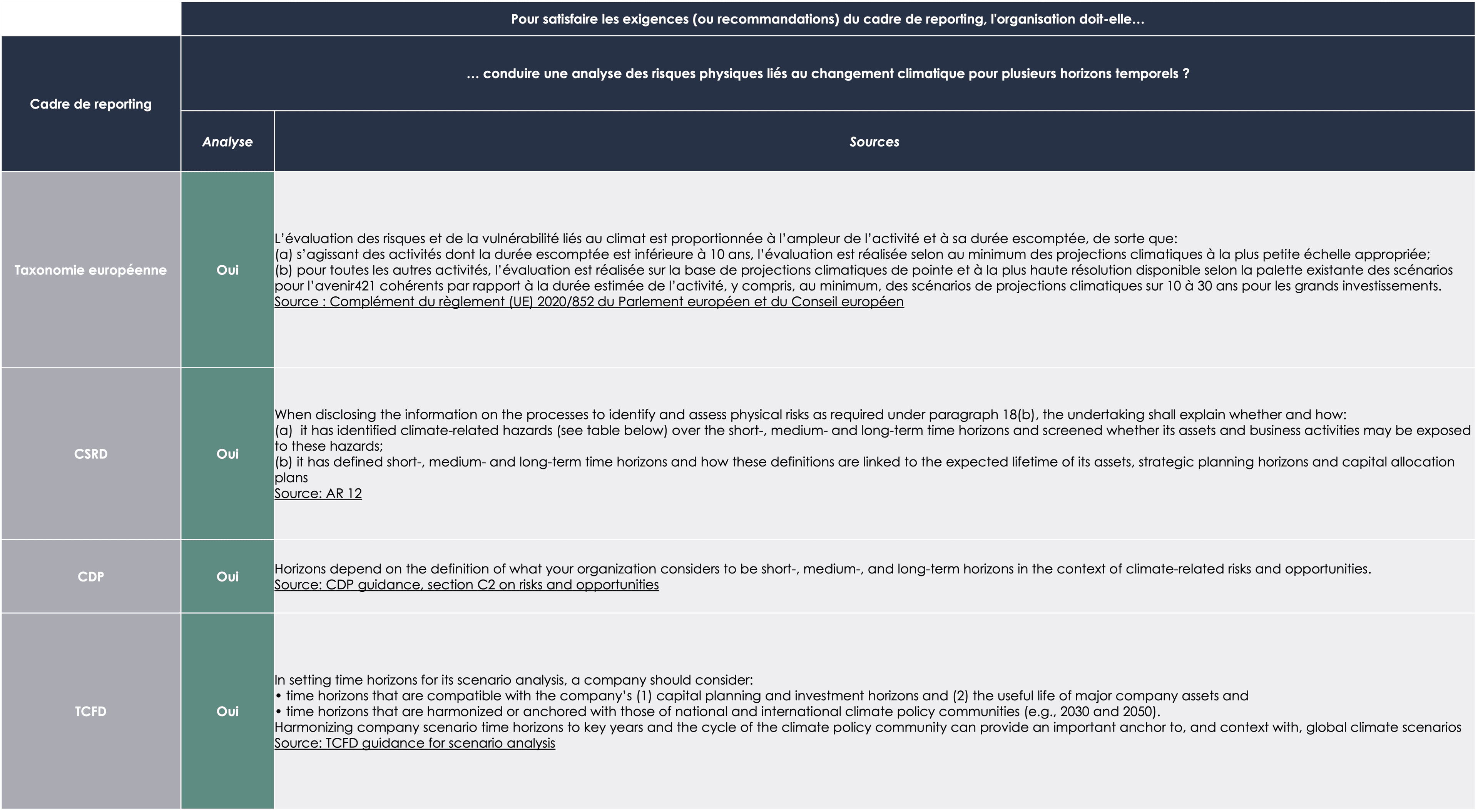 Nous avons effectué un examen détaillé des principaux cadres de reporting des risques physiques. Cette évaluation nous a permis de mettre en évidence les différences principales entre ces cadres et de faciliter la compréhension des spécificités de chacun.