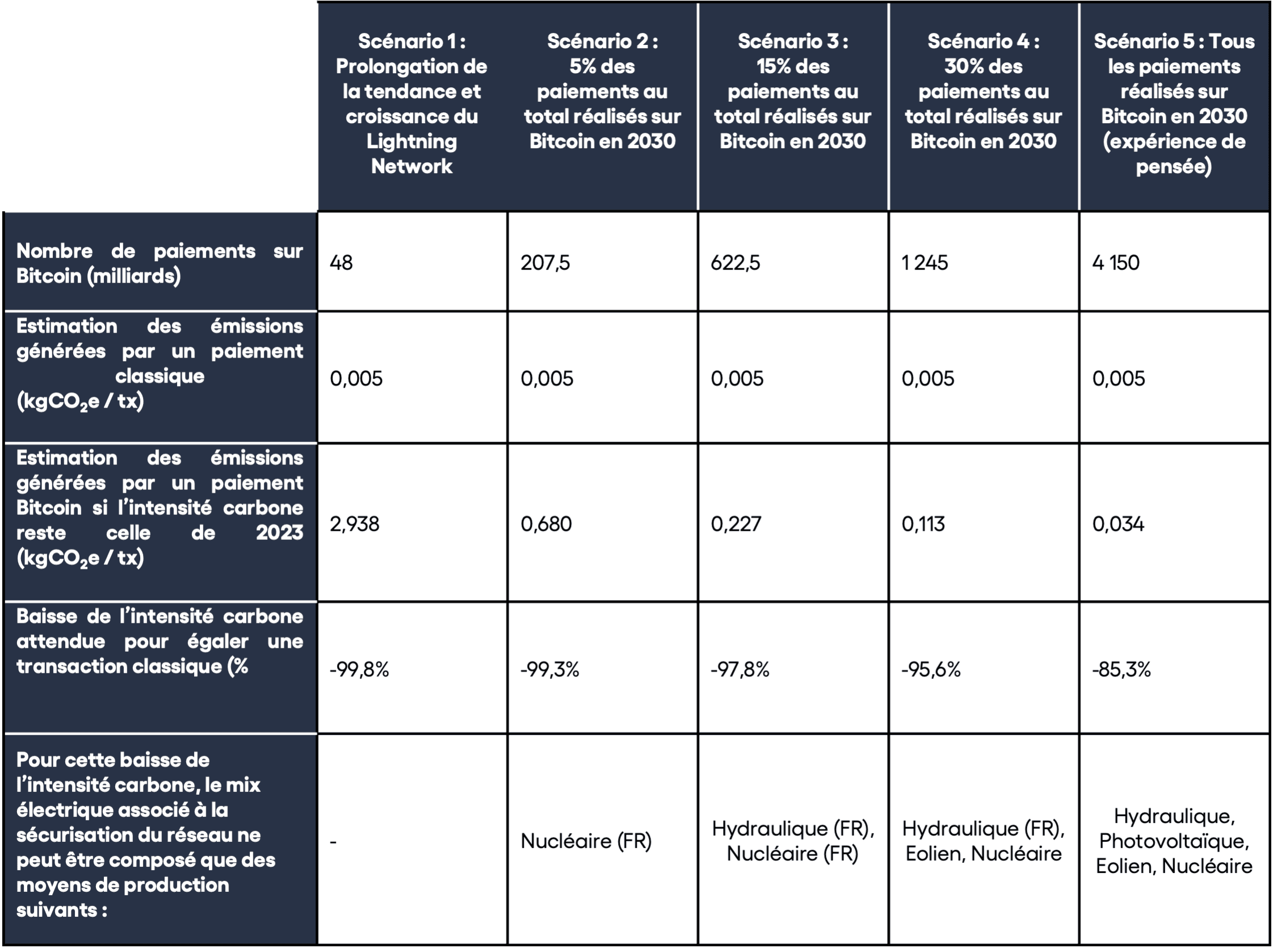 - l’empreinte carbone de Bitcoin ne dépend pas du nombre de paiements réalisés sur le réseau mais de la puissance de calcul mobilisée pour le sécuriser et préserver l’intégrité du registre de transactions (voir https://www.jbs.cam.ac.uk/wp-content/uploads/2020/08/2019-09-ccaf-2nd-global-cryptoasset-benchmarking.pdf, p. 83). Ce mode de fonctionnement rend caduque toute projection fondée sur l’intensité carbone actuelle par transaction : projeter cette intensité carbone dans le temps exige de poser des hypothèses sur l’évolution de la consommation énergétique et les moyens de production d’électricité mobilisés par Bitcoin d’une part, mais aussi sur le nombre de paiements qui transitent par son réseau d’autre part.