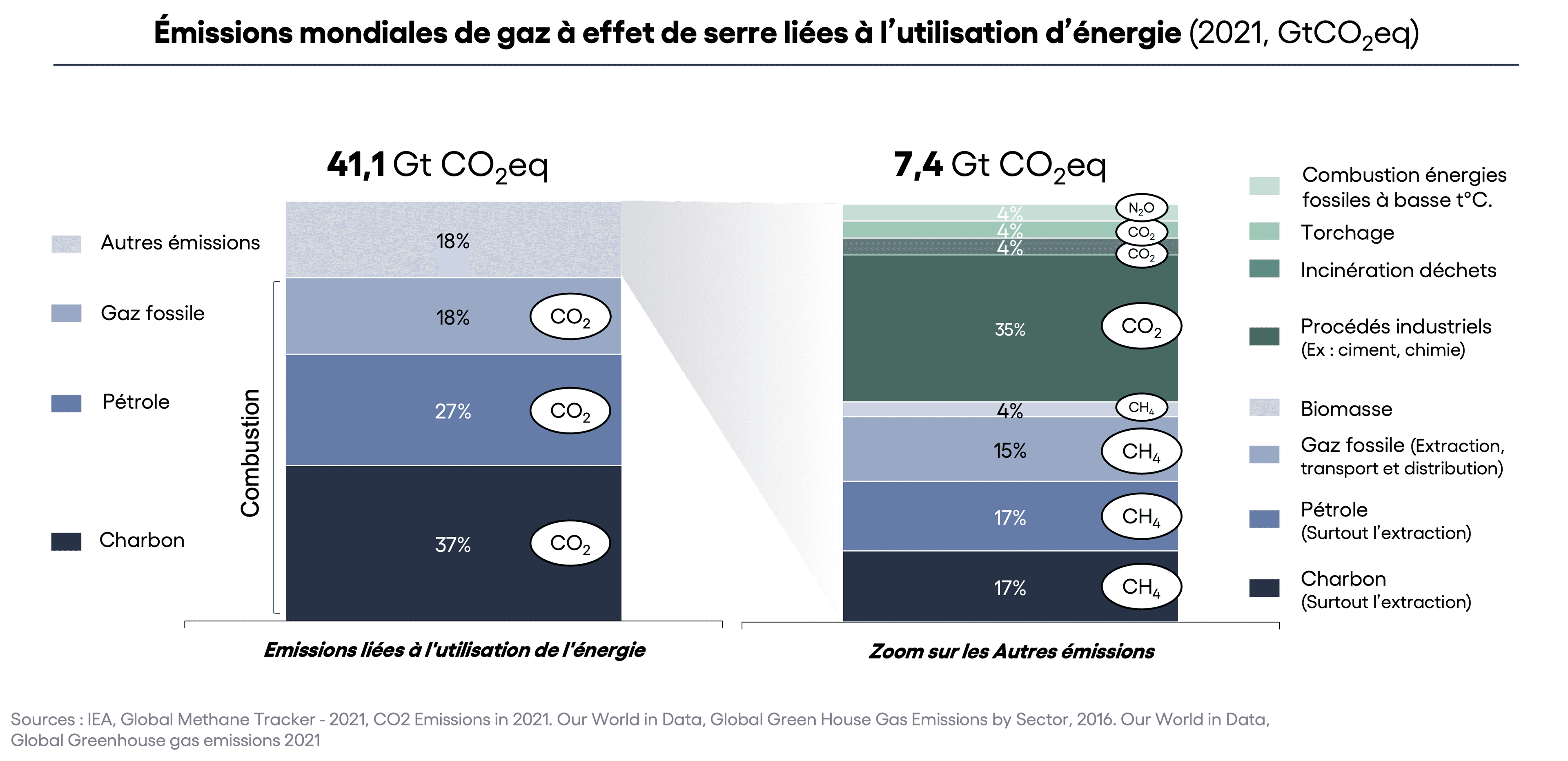 Les émissions de méthane (CH4) représentent 10% des émissions liées à l’énergie. Elles sont notamment dues aux rejets dans les mines de charbon, les sites d’extraction de pétrole et de gaz fossile. Elles sont également émises lors de l’acheminement du gaz fossile, que ce soit par voie terrestre ou maritime. Plus marginalement à l’échelle mondiale, du méthane est émis par la biomasse (combustion incomplète du bois, fermentation au niveau des barrages).