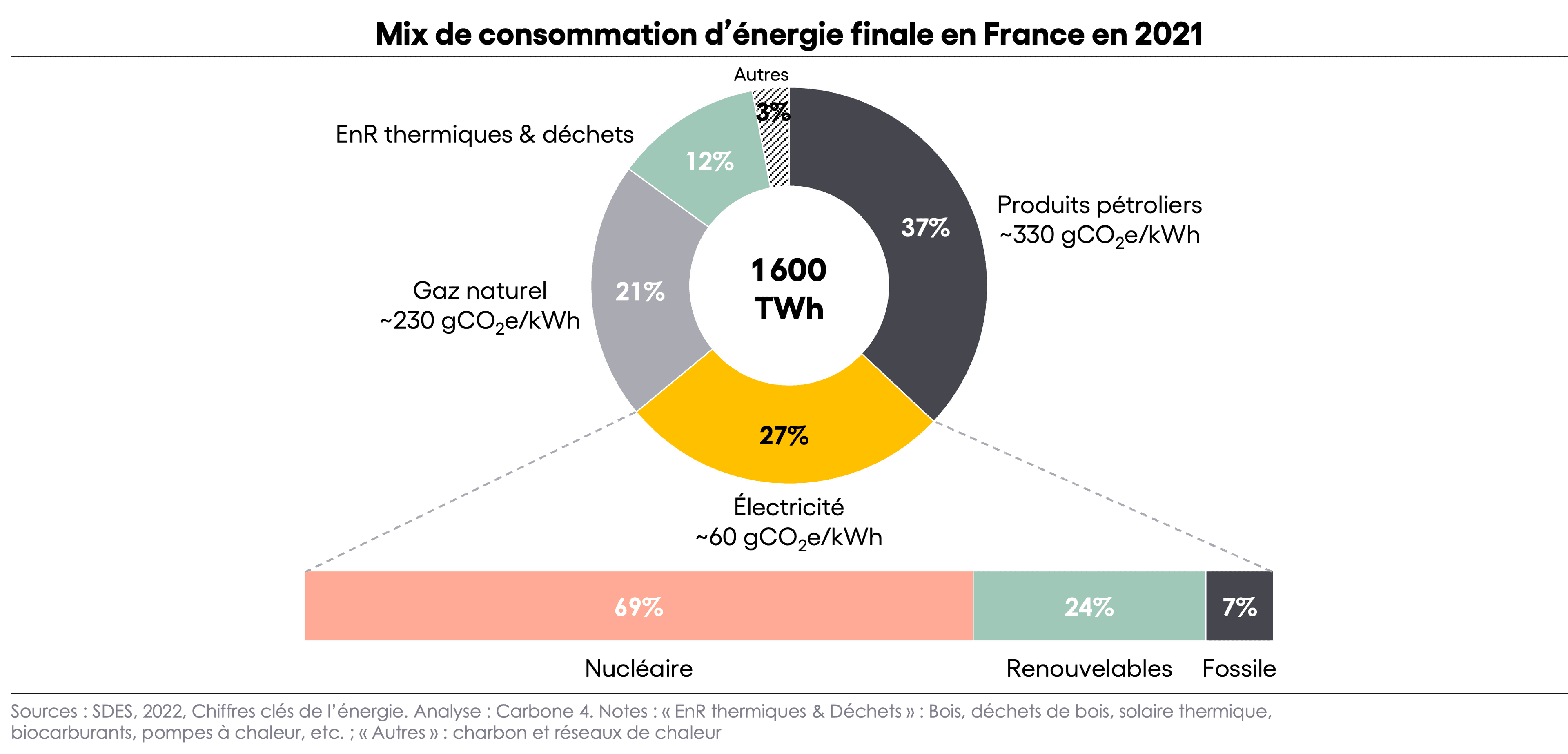L’électricité bas-carbone française a néanmoins un impact significatif. A titre de comparaison, en Allemagne, avec un mix énergétique relativement similaire mais une électricité plus carbonée (~550 gCO2e par kWh électrique), le contenu carbone moyen de l’énergie finale consommée avoisine plutôt les ~300 gCO2e/kWh.