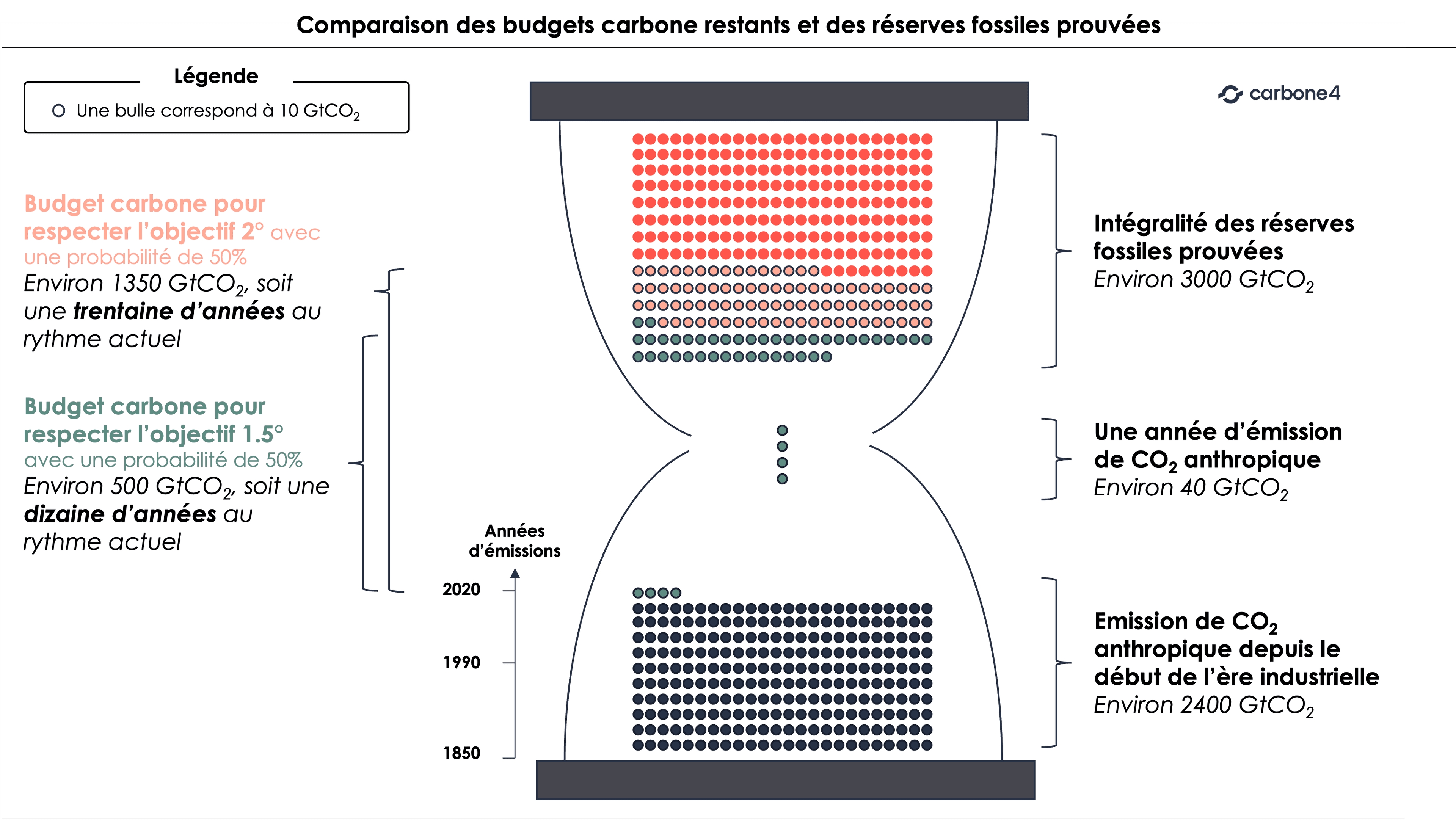 Alors est-ce qu’il nous reste encore du temps ? Au rythme actuel, 1,5°C serait atteint vers 2030 et 2°C vers 2050. Et la pénurie d’énergies fossiles ne nous arrêtera pas : les réserves prouvées d’énergies fossiles - avant tout composées de charbon - correspondent à plus de 3 000 GtCO2[17],soit près de 6 fois le budget autorisé pour respecter un réchauffement de 1,5°C[18], et plus de 2 fois le budget pour tenir 2°C.