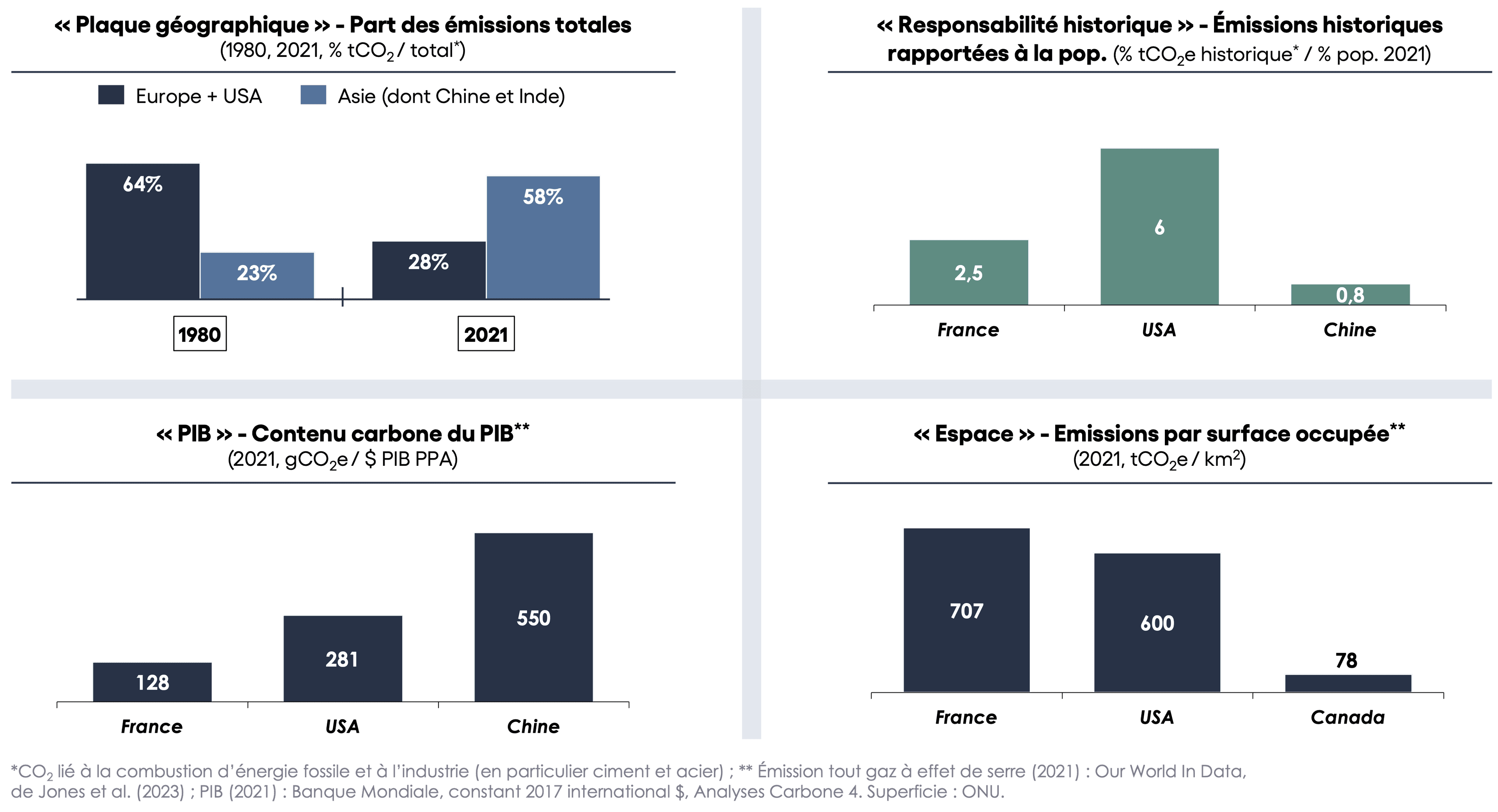 - “Responsabilité historique” : la France a généré environ 2,5% du stock d’émissions de gaz à effet de serre (GES) pour ~1% de la population mondiale actuelle, les Etats-Unis ~24% des GES historiques pour ~4% de la population mondiale actuelle, et la Chine ~14% des GES pour ~18% de la population mondiale actuelle. Un Français “bénéficie” ainsi de trois fois plus d’émissions historiques qu’un Chinois, et aurait donc une capacité plus élevée à agir (par exemple plus d’infrastructures disponibles par habitant).
