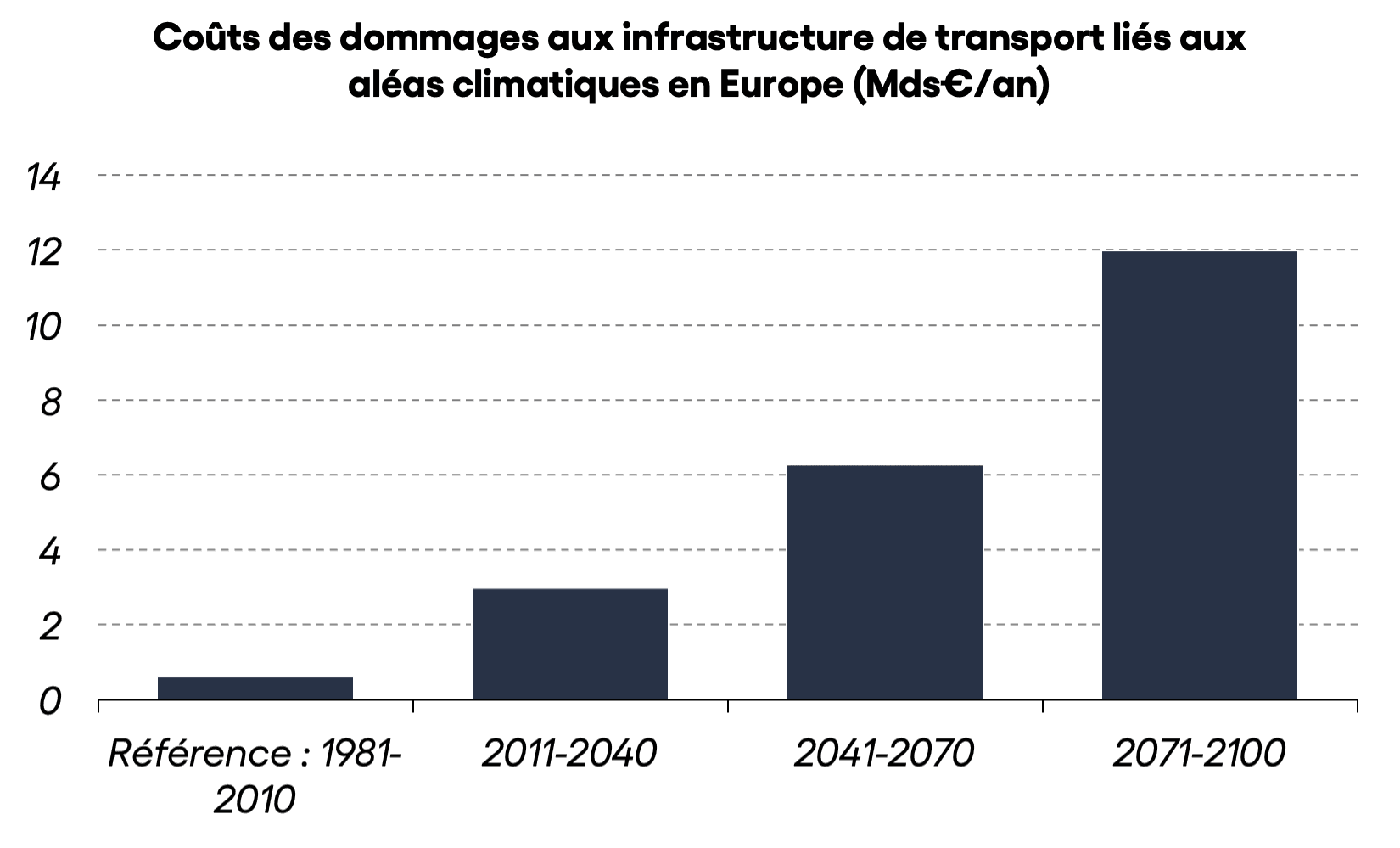 Au total, en Europe les coûts des dommages aux infrastructures de transport liés aux aléas climatiques pourraient passer d’environ 600 millions d’euros par an en moyenne, à 3 milliards sur 2010-2040, 6 milliards sur 2041-2070 et enfin 12 milliards d’euros par an d’ici à la fin du siècle[13] !