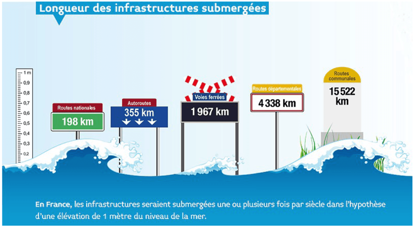 Les dommages sur les infrastructures devraient se multiplier. Ainsi le risque de glissement de terrain affectant des routes est amené à augmenter en Europe et notamment dans des régions telles que l’Alsace[9]. De même, le risque d’inondation des lignes ferroviaires pourrait doubler, voire tripler en Europe[10]. La montée du niveau de la mer viendra aussi menacer l’ensemble des modes de transports comme l’illustre cette infographie[11].