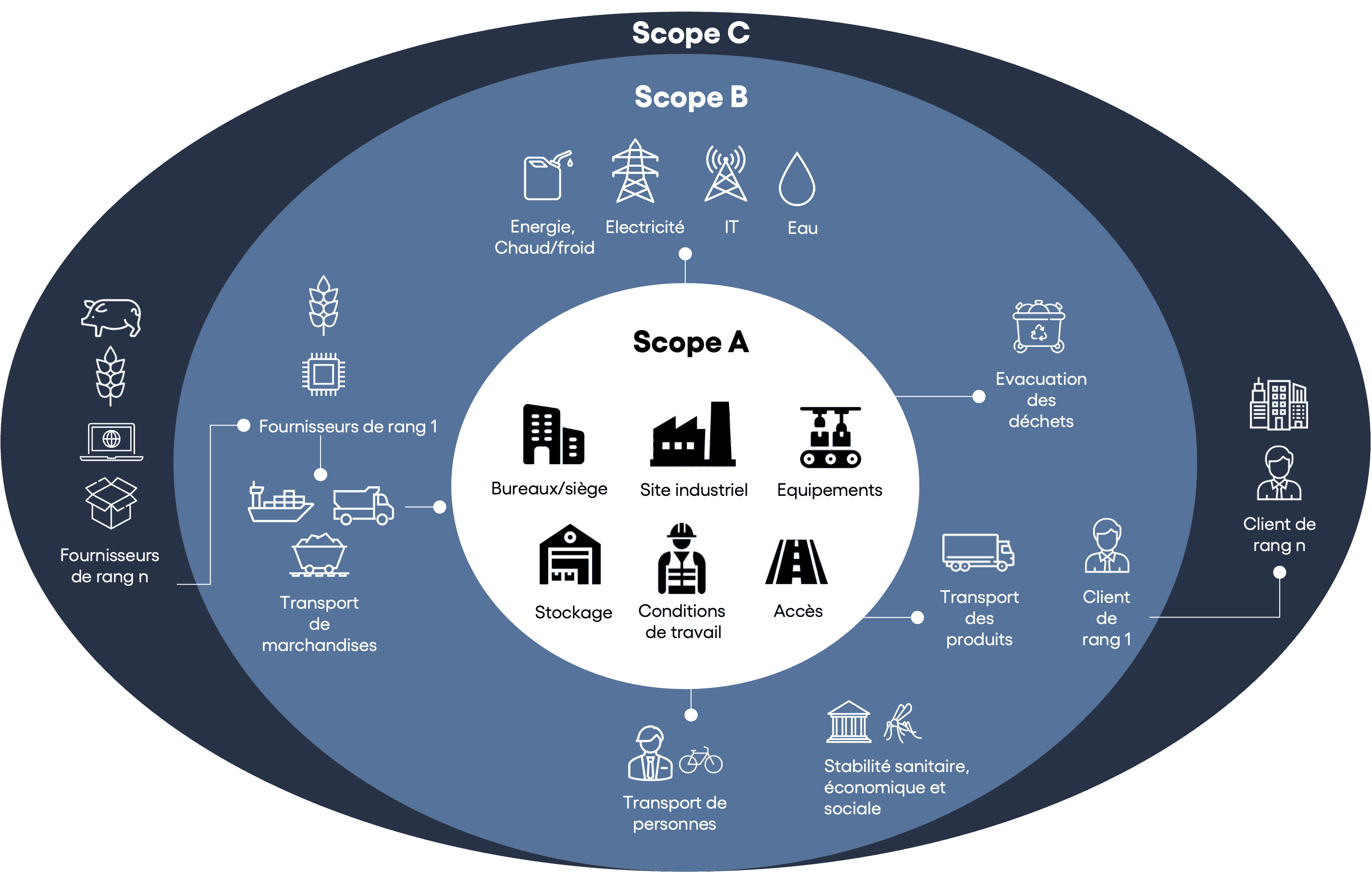 Les risques physiques liés aux aléas climatiques peuvent impacter toute la chaîne de valeur d’une organisation (ex : pénurie de matériaux des fournisseurs, hausse des coûts d’assurance pour les opérations sur site et hausse des coûts de transport vers le client final)
