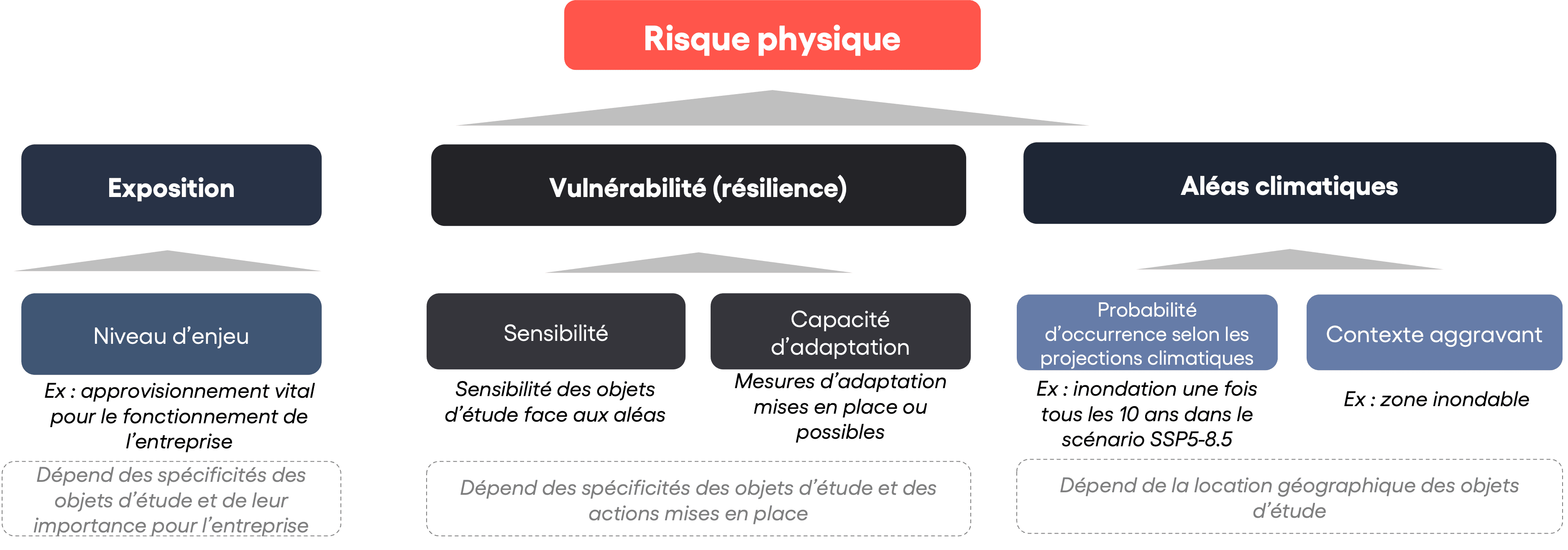 Pour un aléa climatique donné, le risque physique associé est un résultat combinant l’évolution de l’aléa climatique, la vulnérabilité du secteur étudié à cet aléa et l’exposition qui dépend de la répartition des financements dans les secteurs.
