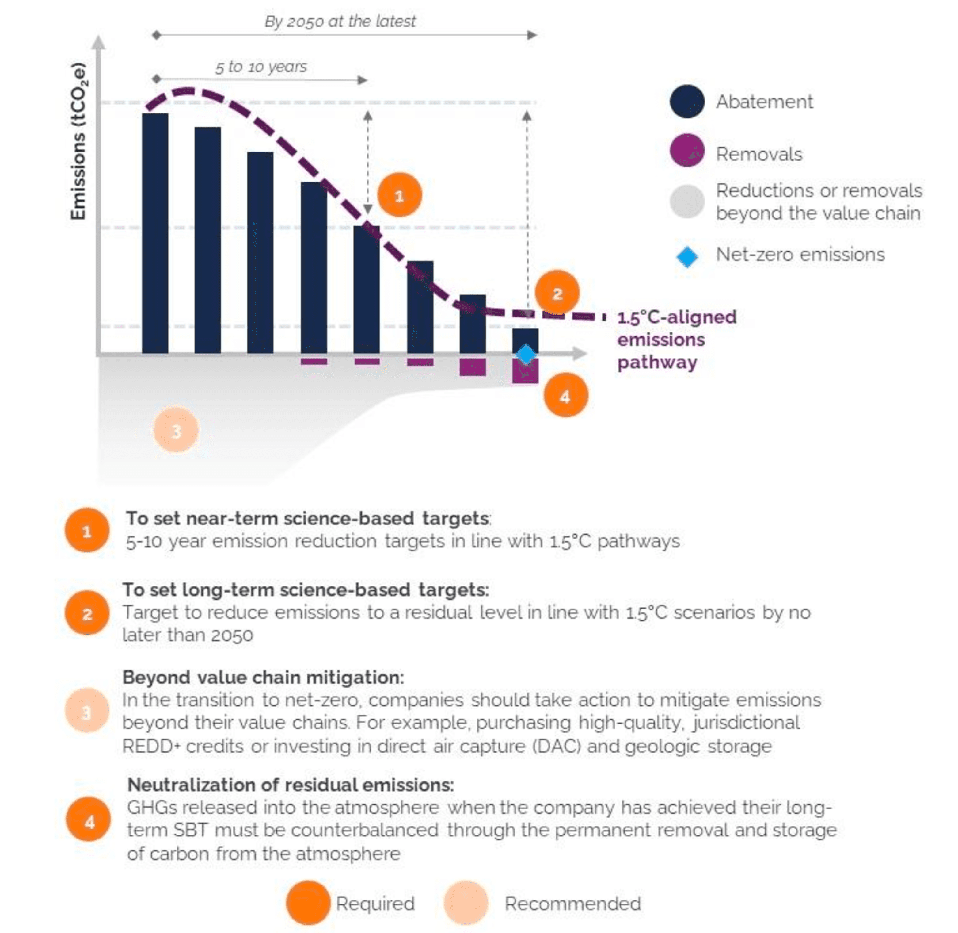 - Étape 4 (obligatoire) « Neutralization of Residual Emissions » qui correspond à la séquestration permanente des émissions résiduelles – émissions ne pouvant être réduites une fois les objectifs de réduction long-terme atteints (~-90% de réduction pour la plupart des entreprises entre aujourd’hui et 2050).