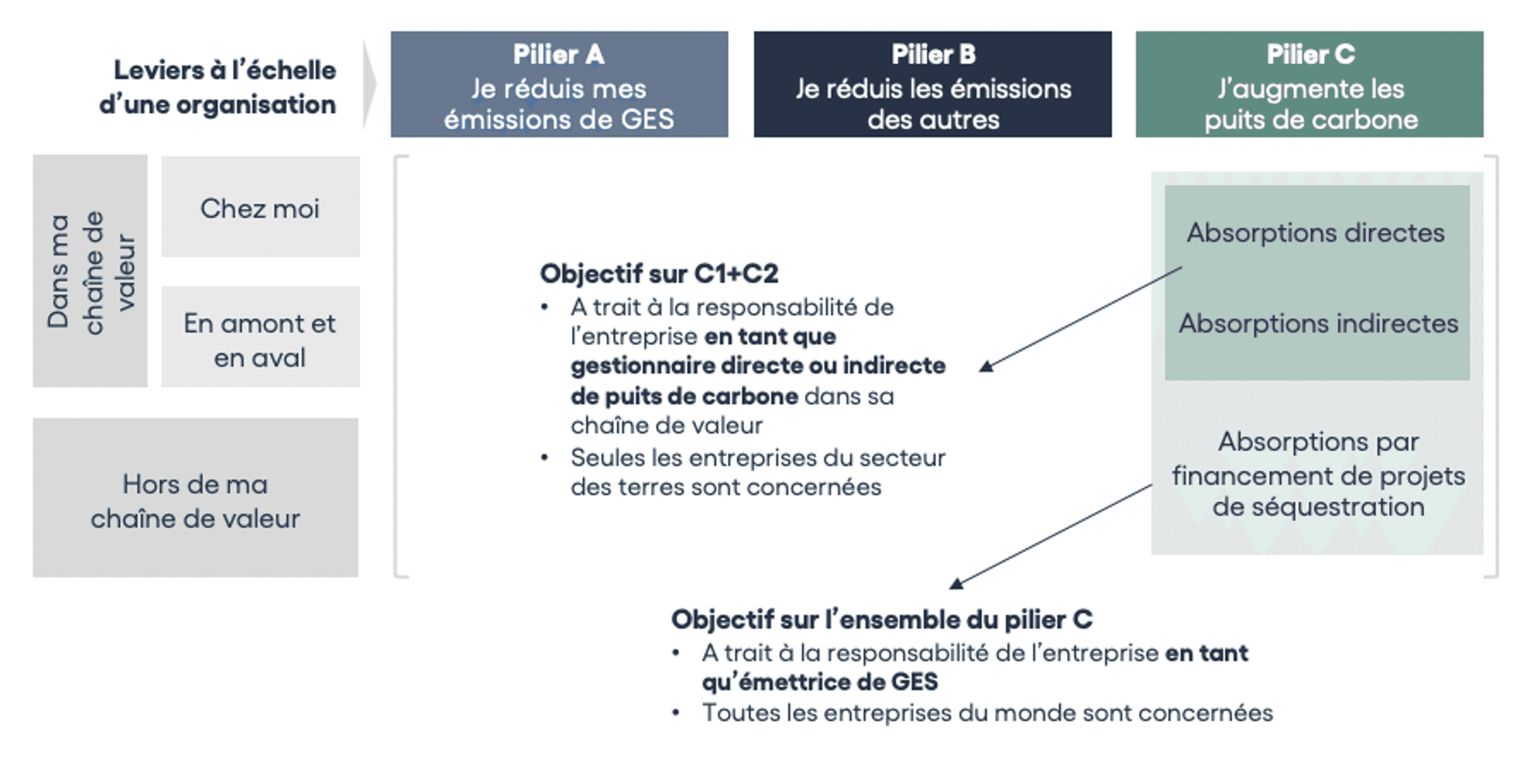 - Un objectif spécifique pour les entreprises du secteur des terres ayant une responsabilité opérationnelle de sauvegarde et développement des puits de carbone dans leur chaîne de valeur (catégorie C1 et C2 du pilier C)