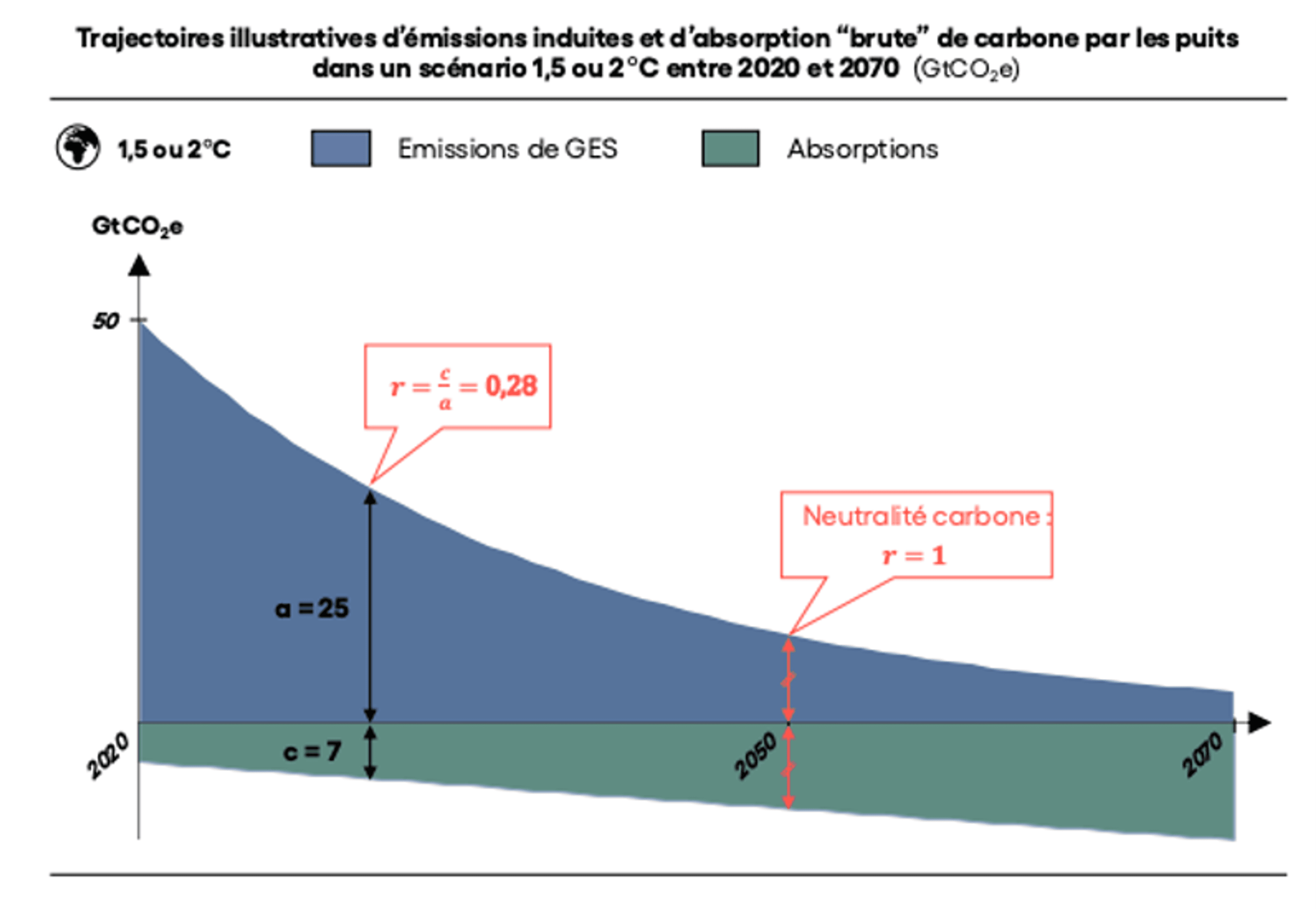 Pour l’objectif global de séquestration carbone sur le pilier C, les entreprises sont amenées à maîtriser l’évolution de leur ratio puits / émissions (ratio Pilier C / Pilier A) au cours du temps, de telle sorte qu’il soit chaque année égal au ratio puits/émissions mondial ou au ratio du territoire auquel il s’identifie (cf. graphique). Par exemple, pour 1 tCO2eq émise en 2030, l’objectif est de séquestrer 0,2 tCO2 (vs 1 en 2050) dans un scénario +1,5°C monde. Cette démarche permet de se fixer des objectifs intermédiaires et de développer des capacités techniques et financières en vue de la neutralisation des émissions résiduelles à long terme.