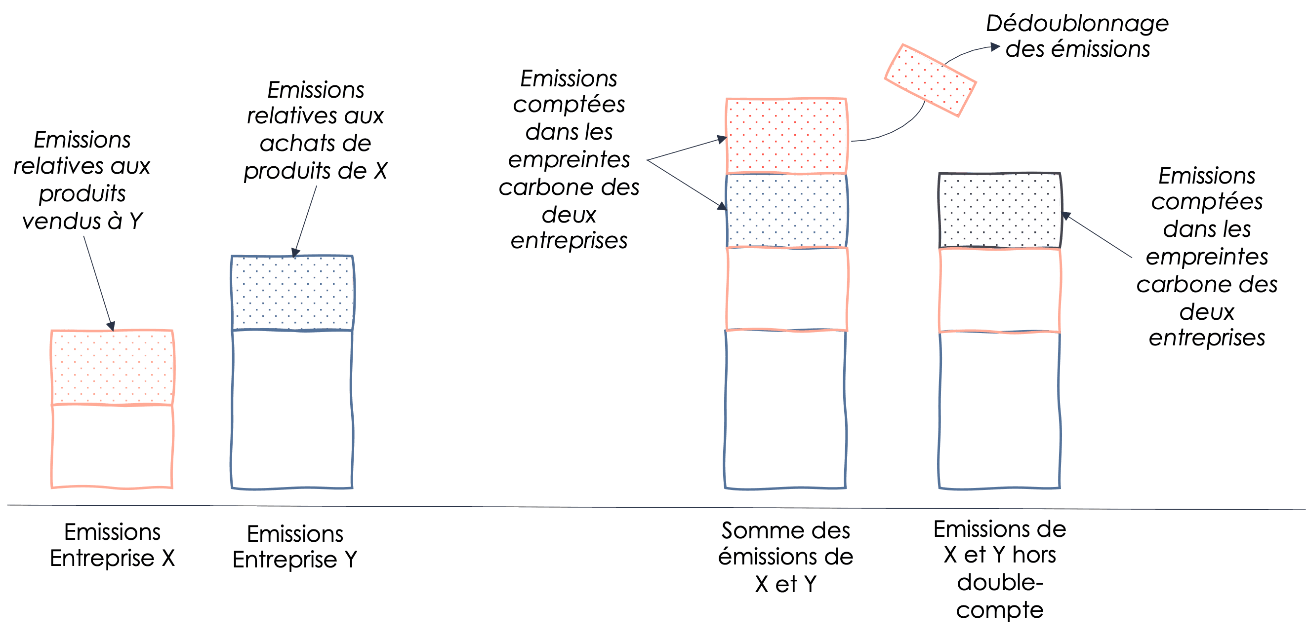 Exemple : Sur la figure ci-dessous, si une entreprise X produit de l’acier pour une entreprise Y qui le transforme, alors la somme des deux empreintes carbone occasionne un double-compte. Dans l’empreinte carbone de Y, une partie de son scope 3 correspond aux achats de produits de X et est déjà comptabilisée dans l’empreinte carbone de X. Si ces deux entreprises se fixent indépendamment un objectif pilier C proportionnel à leurs émissions induites, alors la quantité totale de puits à développer par ces deux entreprises sera mécaniquement plus grande que la quantité réellement nécessaire.