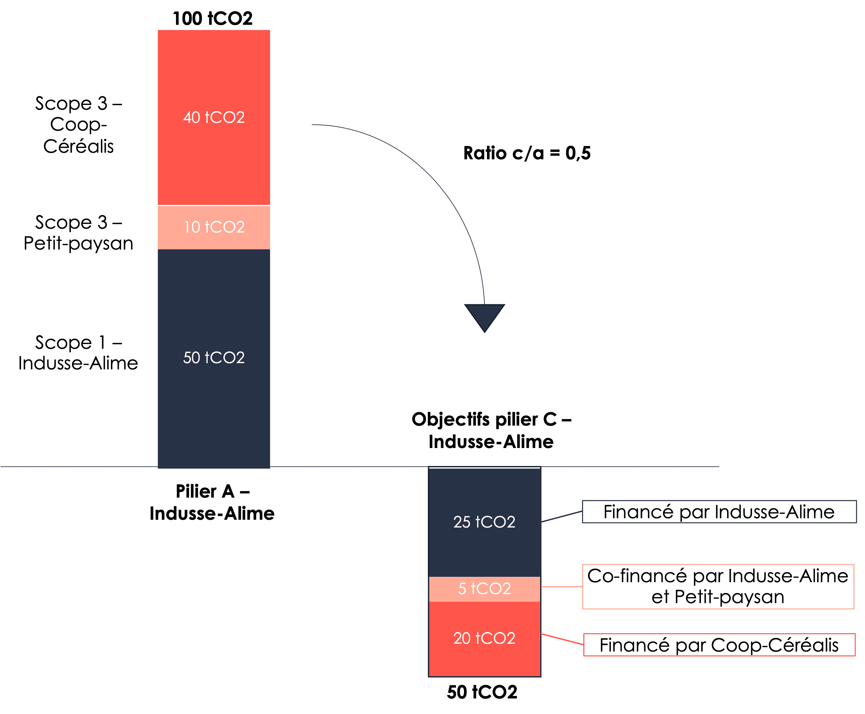 - Afin de mutualiser les coûts et faciliter la mise en œuvre opérationnelle de l’atteinte de ces différents objectifs de séquestration, Indusse-Alime décide de créer un fond carbone dont elle prend la responsabilité opérationnelle, et dans lequel les trois entreprises contribuent financièrement selon le niveau convenu collectivement de responsabilité : 27,5tCO2 pour Indusse-Alime, 20tCO2 pour Coop-Céréalis, et 2,5tCO2 pour Petit-paysan.