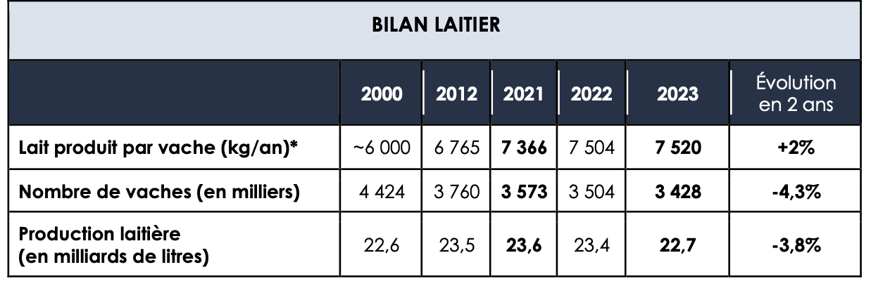 Concernant le lait, la hausse du rendement laitier ces dernières années ne compense plus la baisse du cheptel ; la production laitière a diminué de 3,8% en 2 ans (comme le décrit le tableau ci-dessous) :