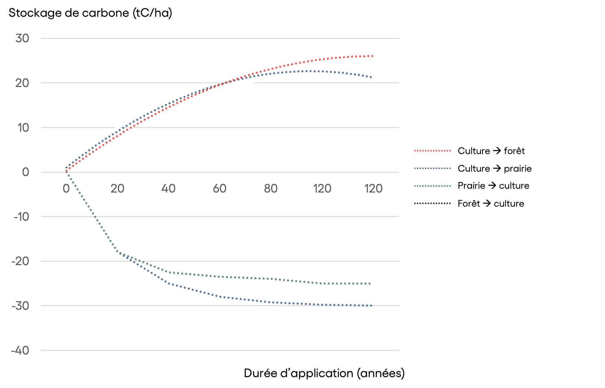 Les cinétiques de stockage / déstockage du carbone entraînées par des changements d'affectation des sols sont des phénomènes qui s’inscrivent sur de longues périodes. Le graphique ci-dessous montre que le passage d’une prairie vers une culture est tout aussi déstockant sur les 20 premières années qu’un passage d’une forêt vers une culture. Par ailleurs, la vitesse de déstockage à une échelle de 20 ans est deux fois plus rapide que la vitesse de stockage. Le passage d’une culture vers une prairie ou une forêt ne compense donc pas sur les 20 premières années la perte de stockage de carbone dans les sols associées à la conversion d’un élevage extensif vers une exploitation de grande culture.