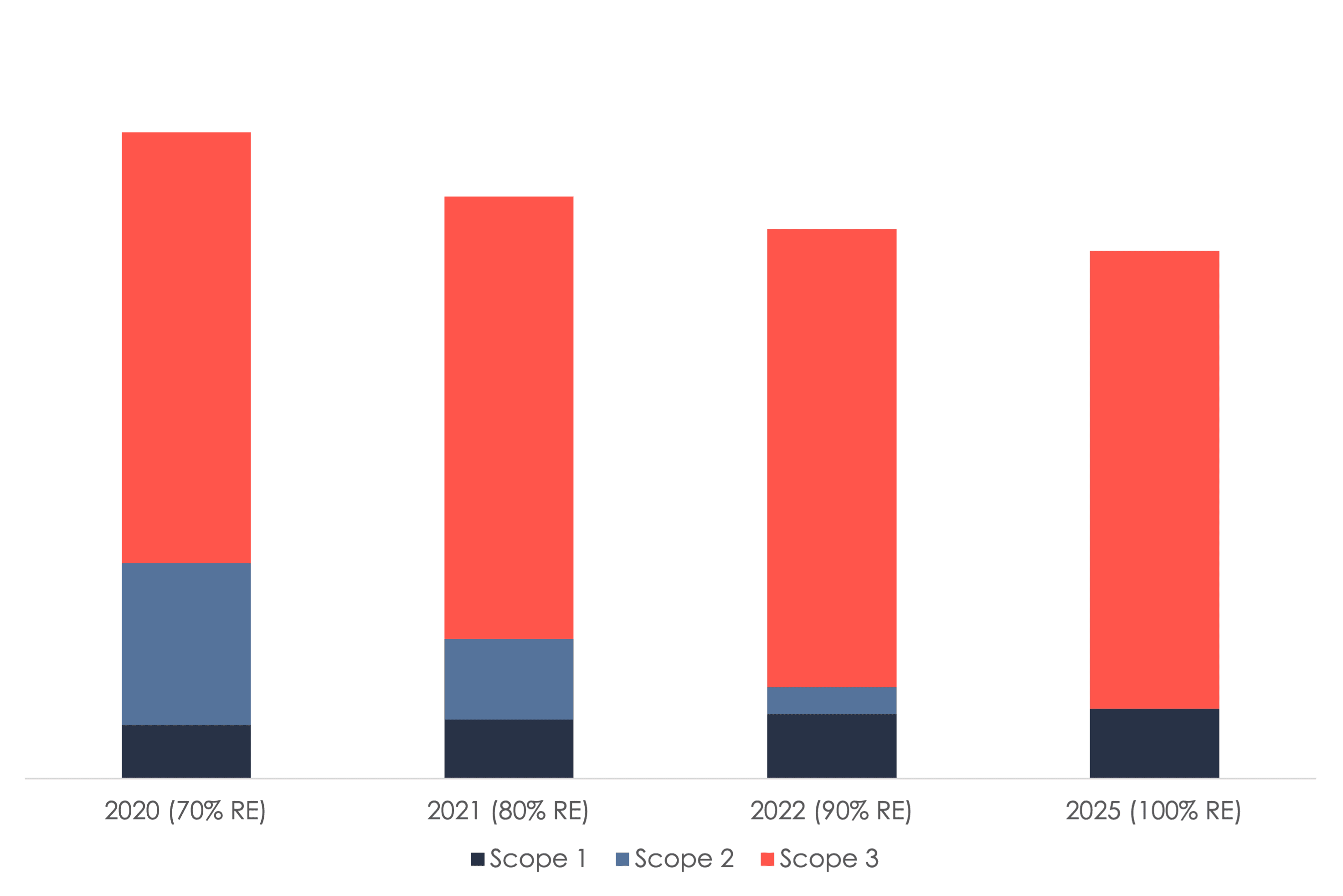 With roughly 100% of electricity consumption covered by ‘green’ electricity purchases, Scope 2 emissions are no longer compressible (as they are close to zero) and can no longer carry the entire decarbonization strategy of the hyperscalers, as highlighted by the figure below.