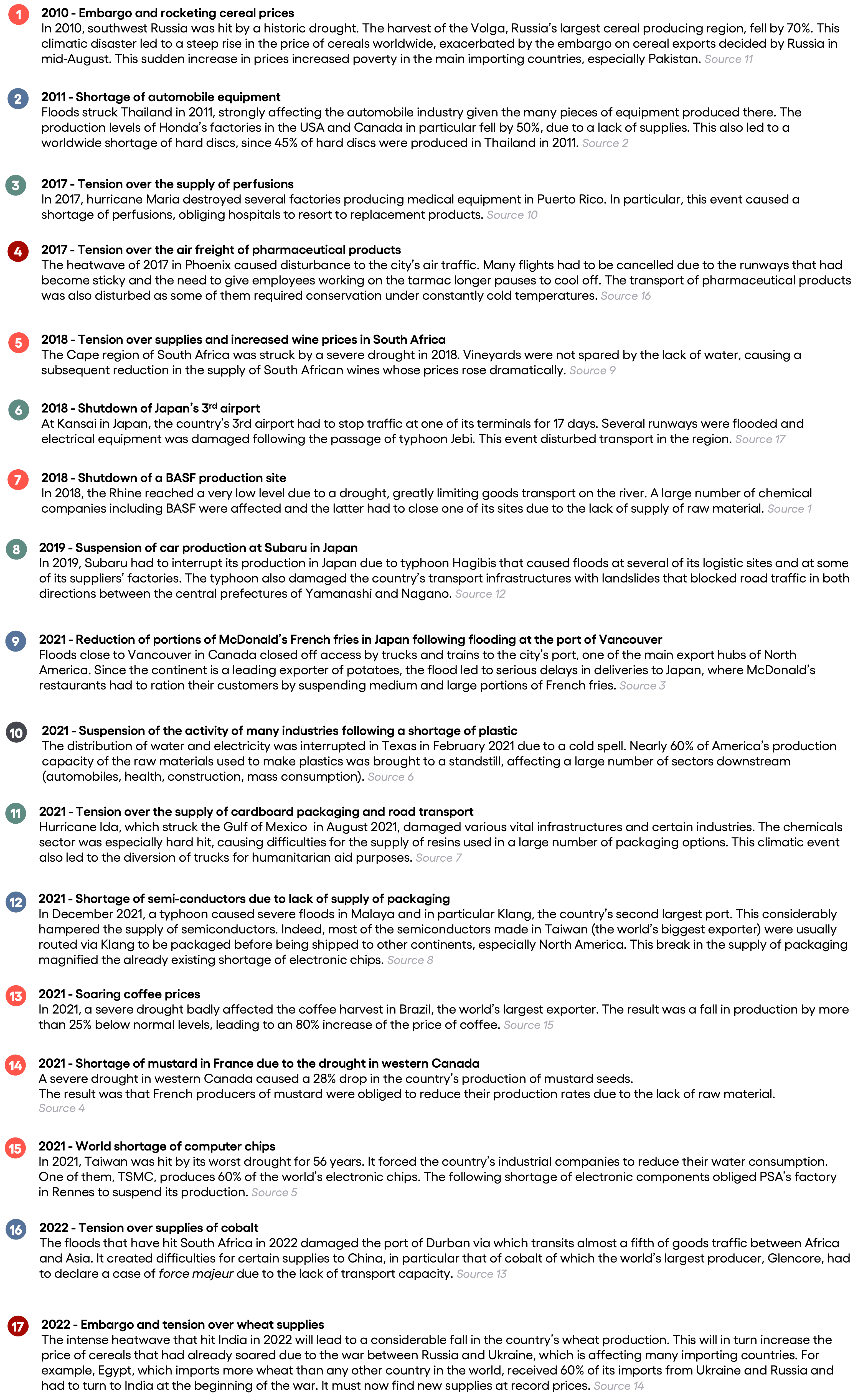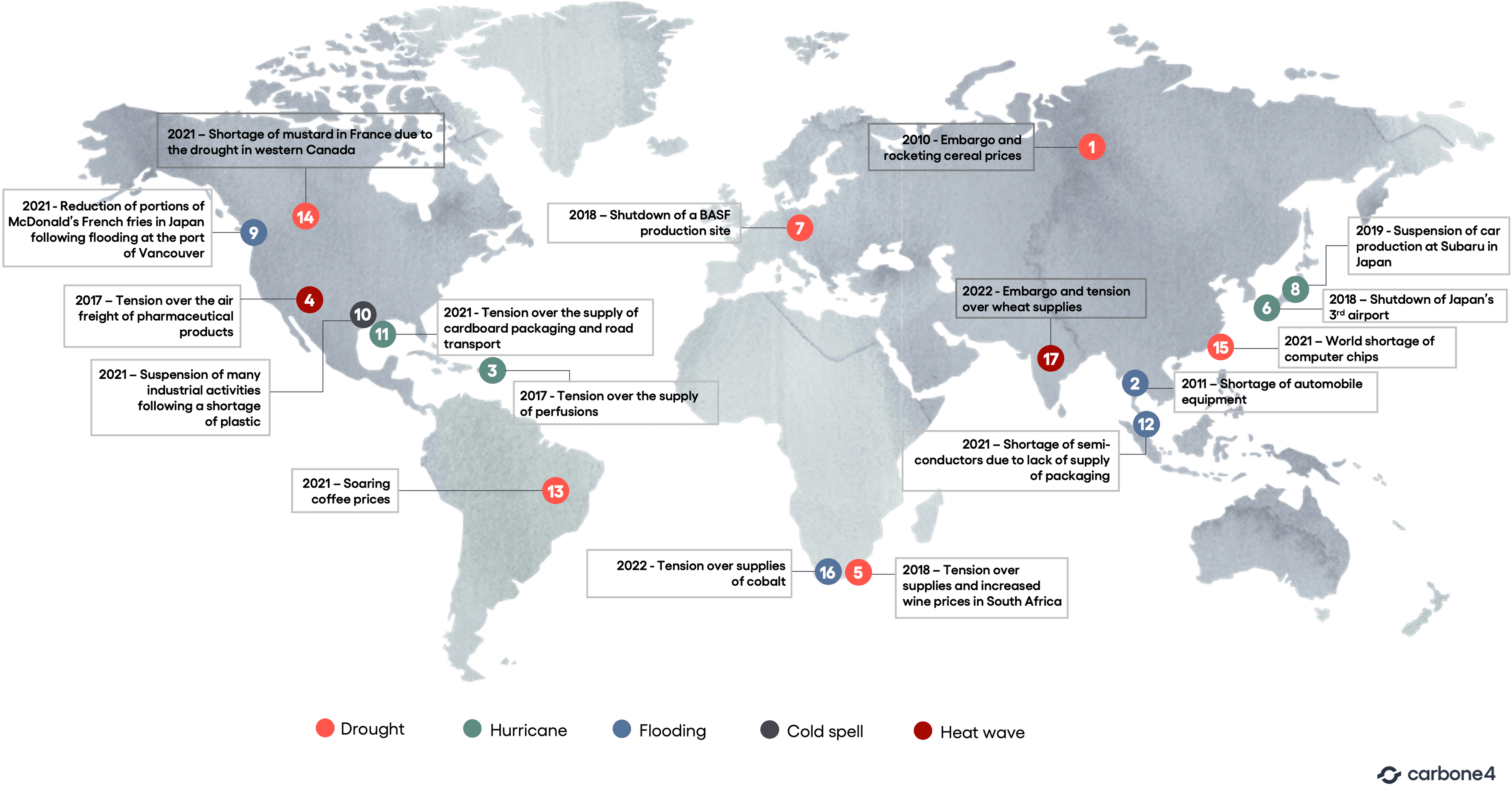 Carbone 4 provides a (non-exhaustive) overview of recent climate events that have impacted supply chains and an analysis of their climatic resilience.