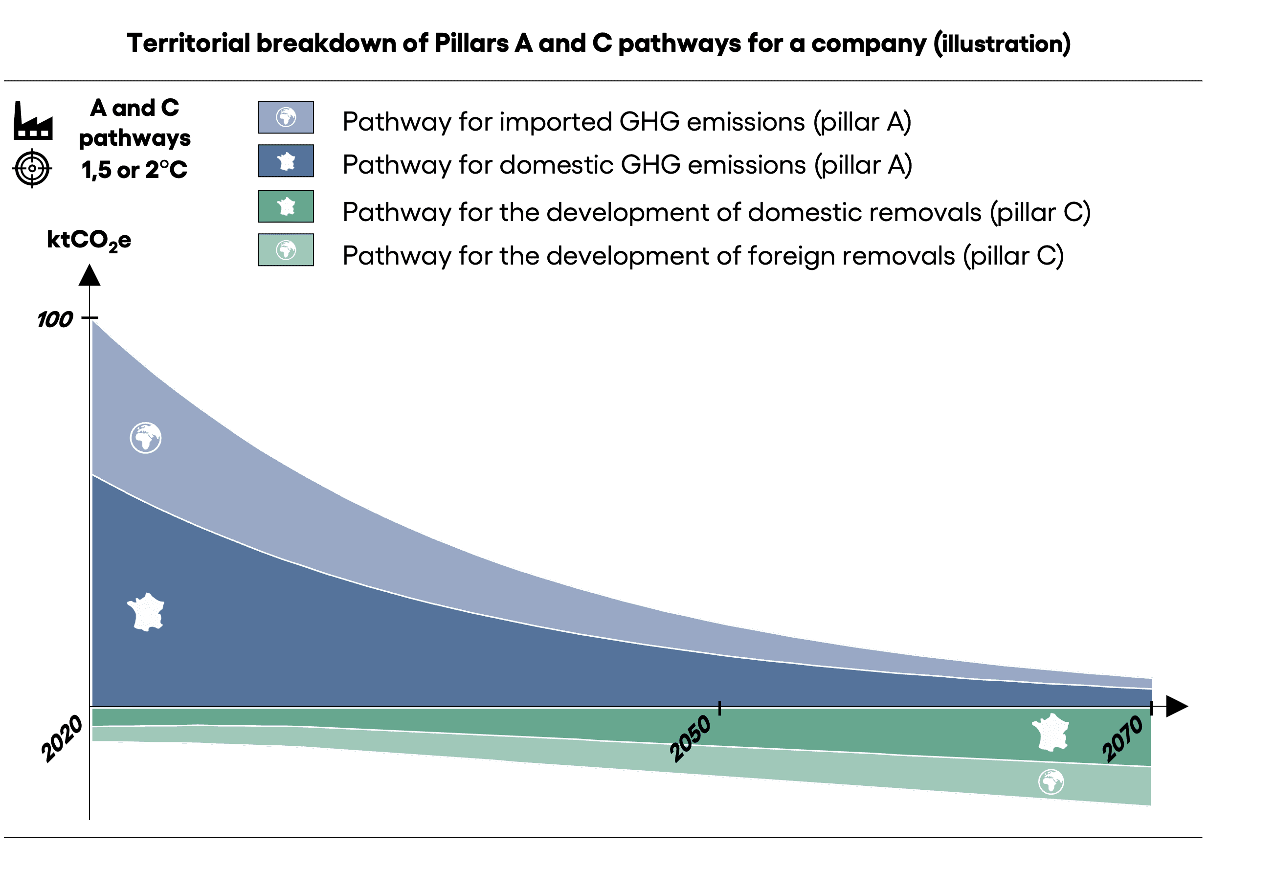 Thus, at any given time, the company's ratio (Pillar C / Pillar A) must be equal to the removals/emissions ratio of the territory with which it is identified (whether it is the planet or the national territories where its activities take place).