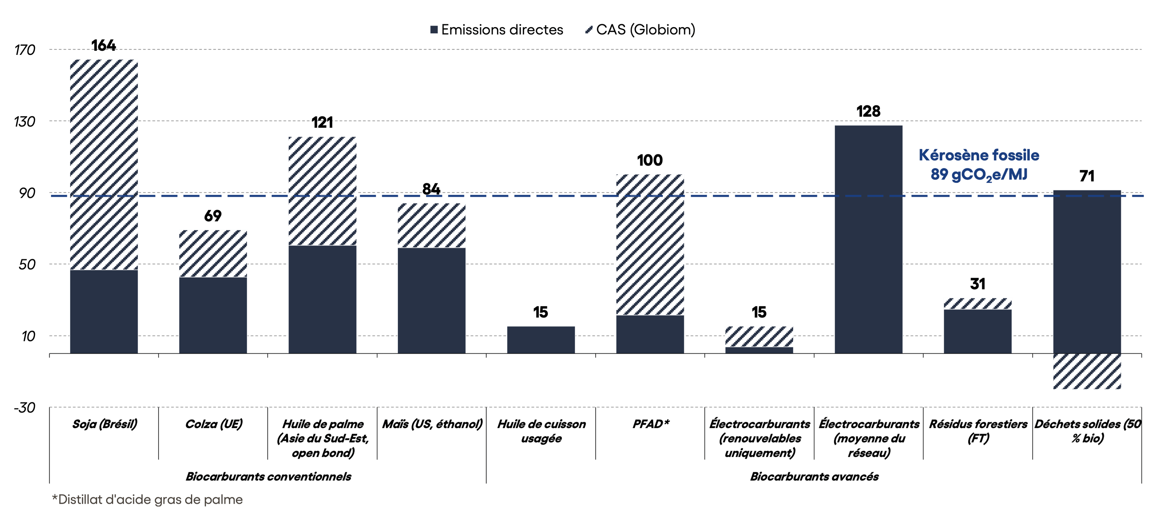Le développement des SAF représente donc un levier important, mais non suffisant pour l'aviation : d’une part, les différents types de SAF ont une empreinte carbone variable et parfois supérieure à celle du kérosène fossile, et d’autre part les ressources nécessaires à leur production sont limitées et convoitées par d’autres secteurs.