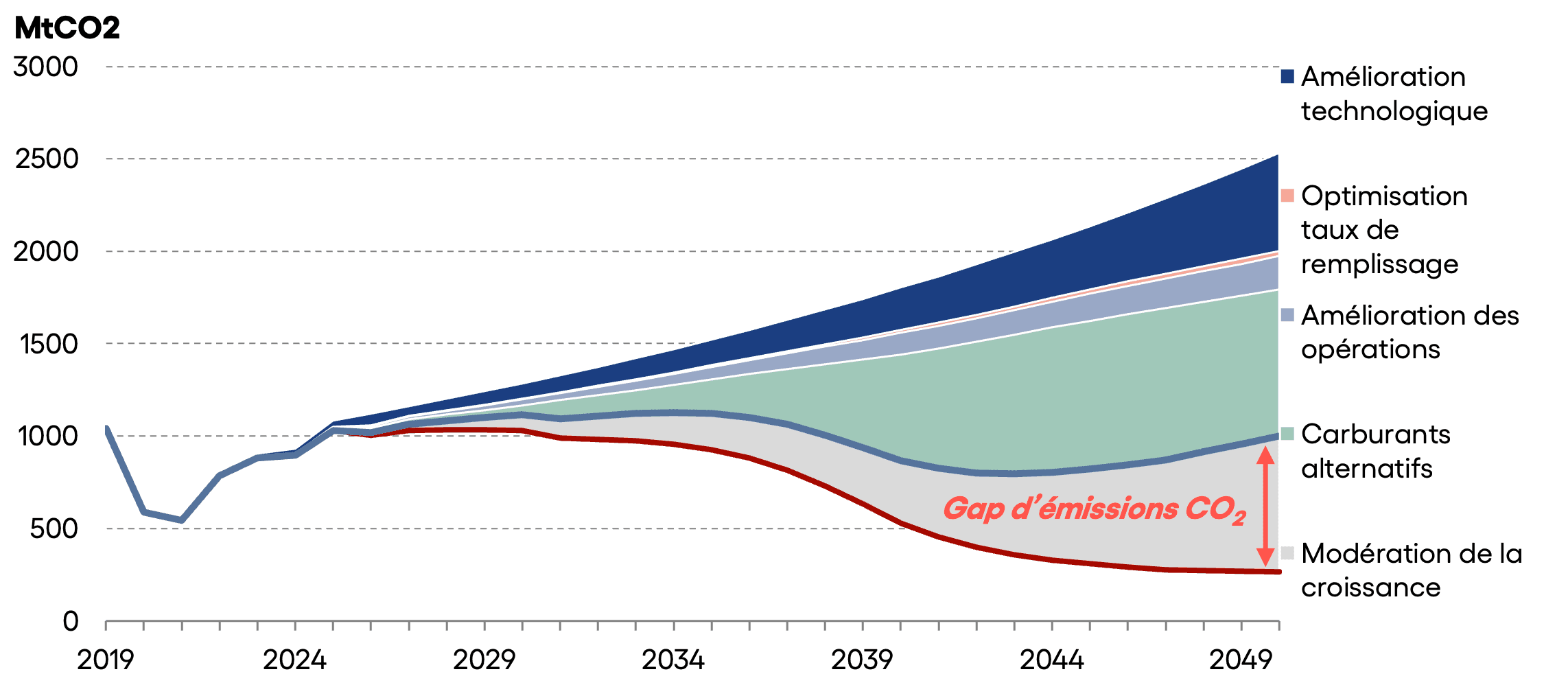 Afin de maintenir le réchauffement planétaire sous les +2°C le secteur s’est fixé comme objectif de 0 émissions nettes (soit ~135 MtCO2 d’émissions résiduelles, ie une réduction de 85%, selon l’ATAG). Or, ce défi sera d’autant plus ambitieux à relever qu’il anticipe une croissance du trafic passagers allant de 3,1% à 3,6% par an, soit une multiplication par au moins 2,5 à horizon 2050.