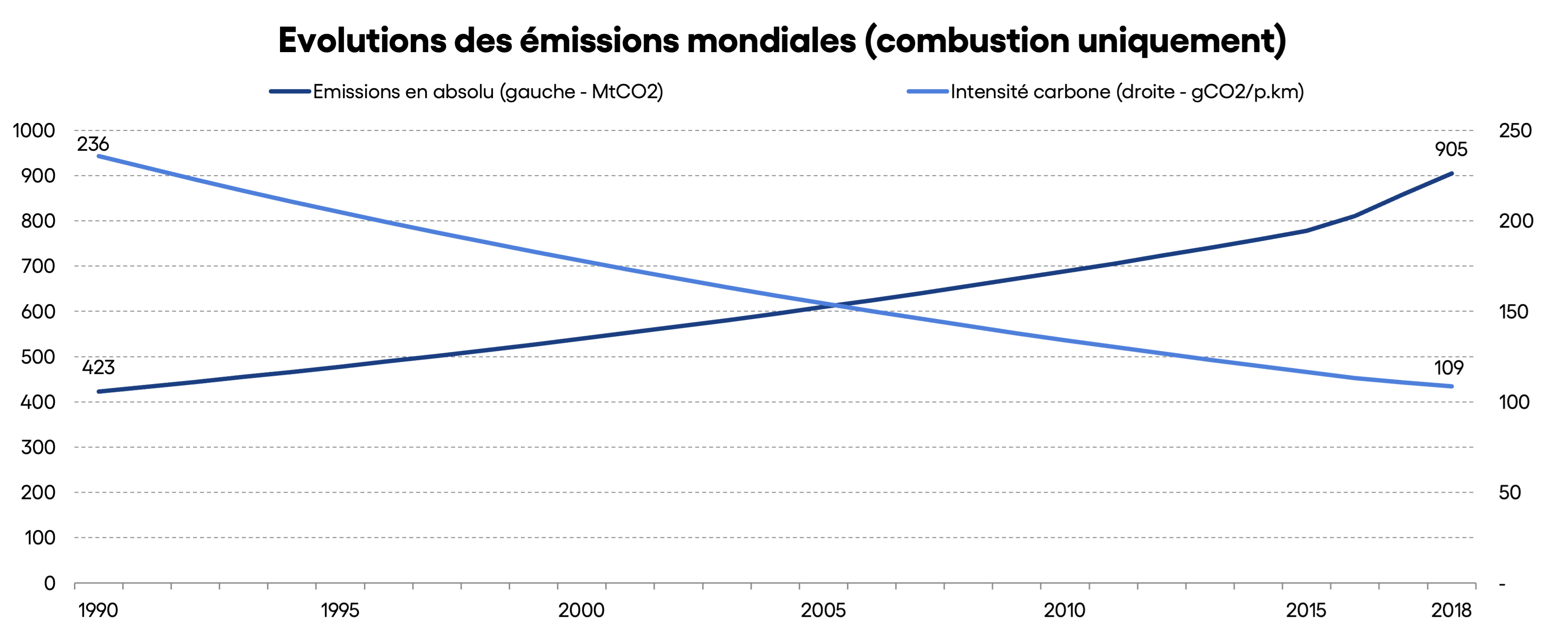 Cependant, il ne faut pas confondre émissions en intensité (par passager.km) et émissions en absolu ! Comme le trafic a été multiplié par 4,6 sur la même période, les émissions totales ont plus que doublé. Cela traduit un phénomène appelé “effet rebond” : comme on économise du carburant, voler coûte moins cher, et donc on vole plus…