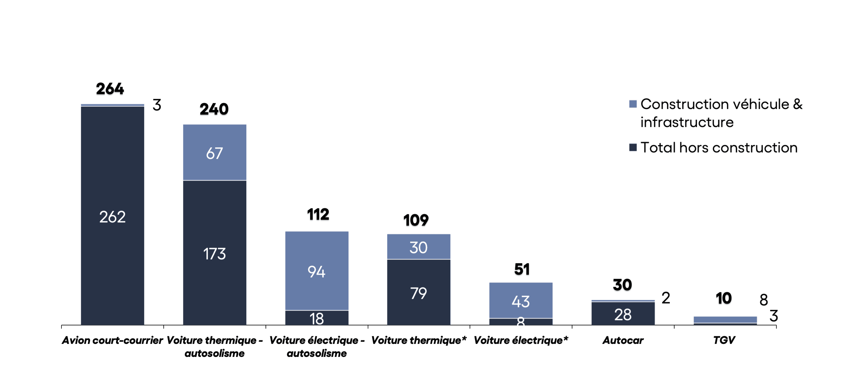 L’autre argument souvent brandi, notamment contre le train, est que l’impact des infrastructures n’est pas pris en compte. Au-delà du fait que cela n’a de sens de les prendre en compte que lorsqu’on réfléchit sur le long terme pour des constructions de nouvelles infrastructures (les aéroports ou les rails ne vont pas changer d’ici à ce que vous fassiez votre prochain voyage), on peut voir sur le graphe ci-dessous que cela ne modifie pas la hiérarchie carbone des transports.