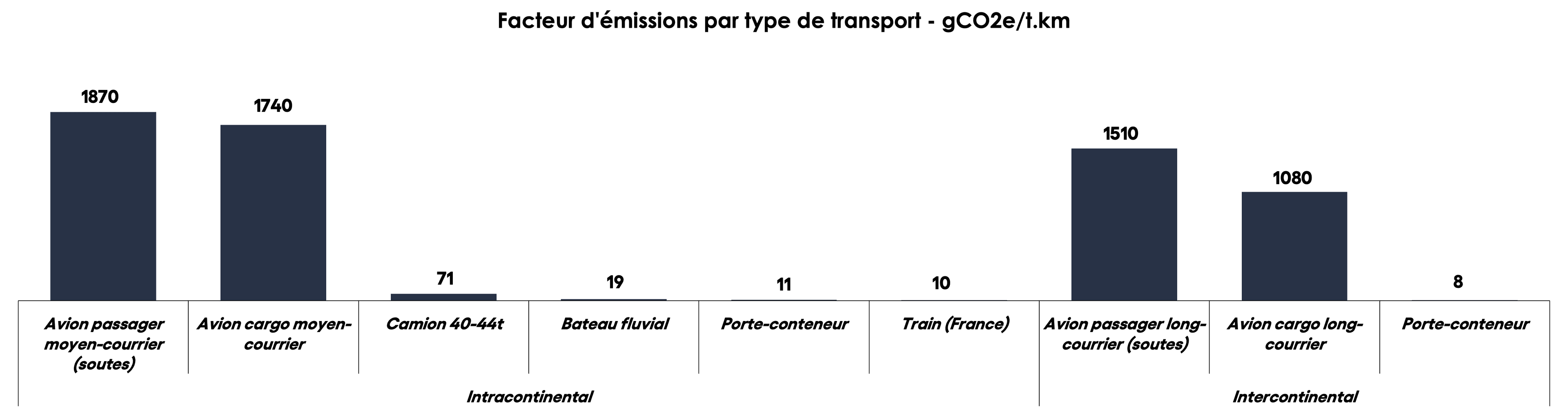 En 2020, le fret aérien représentait moins de 0,5 % des marchandises transportées en Europe pour 10 % des émissions associées au fret. En effet, sur le type de distance sur lequel il opère, l’avion est 25 fois plus émetteur que le camion, et plus de 100 fois plus émetteur que le train ou le bateau ! Avec une part stable jusqu'au début de la crise Covid, le transport de marchandises par avion a considérablement crû depuis, notamment avec l'émergence du e-commerce. Ainsi, il a progressé de 19 % entre 2020 et 2021, et c'est une tendance qui devrait se poursuivre selon l’association des compagnies aériennes IATA, avec une augmentation des émissions en conséquence.