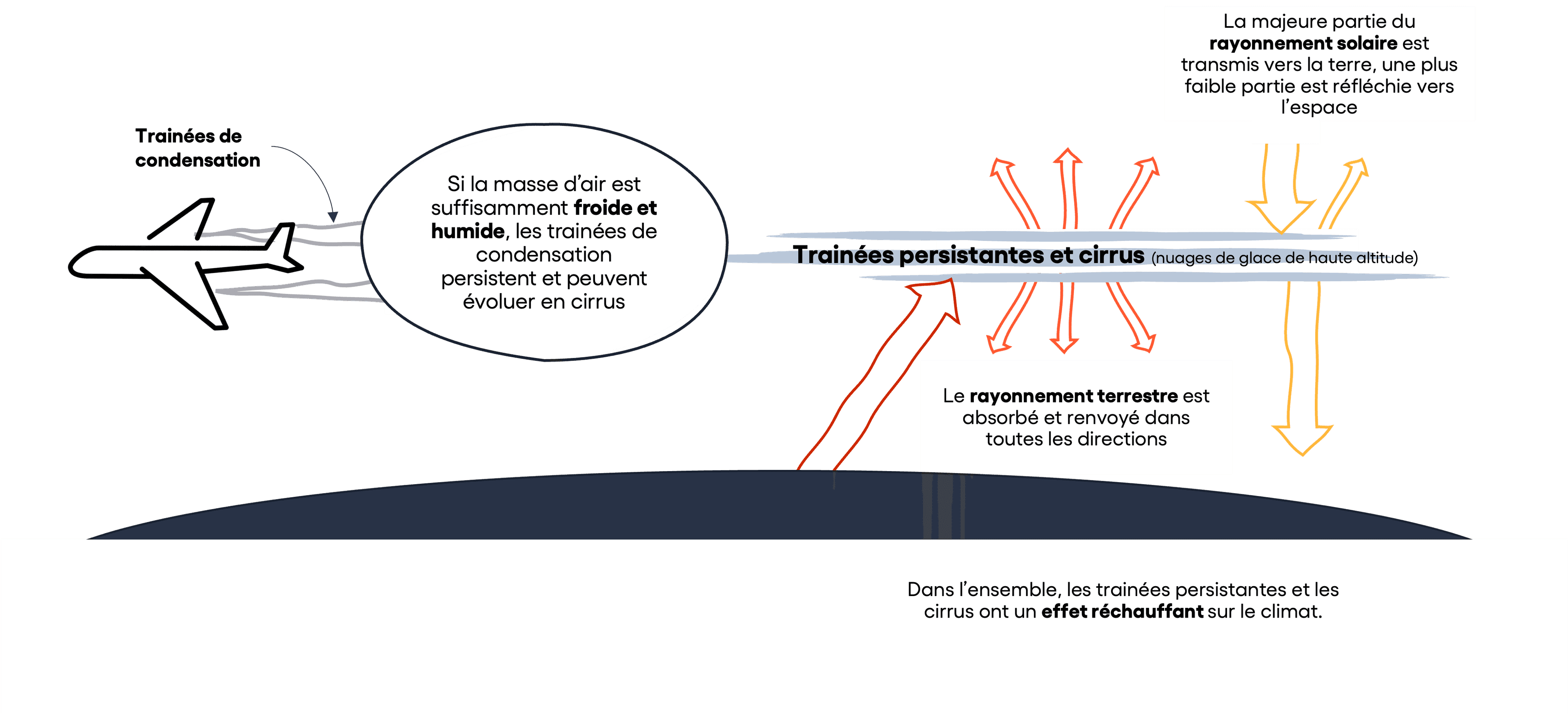 - Enfin, tout comme pour le CO2, le moyen le plus certain pour réduire l’effet des traînées de condensation demeure la réduction du trafic aérien !