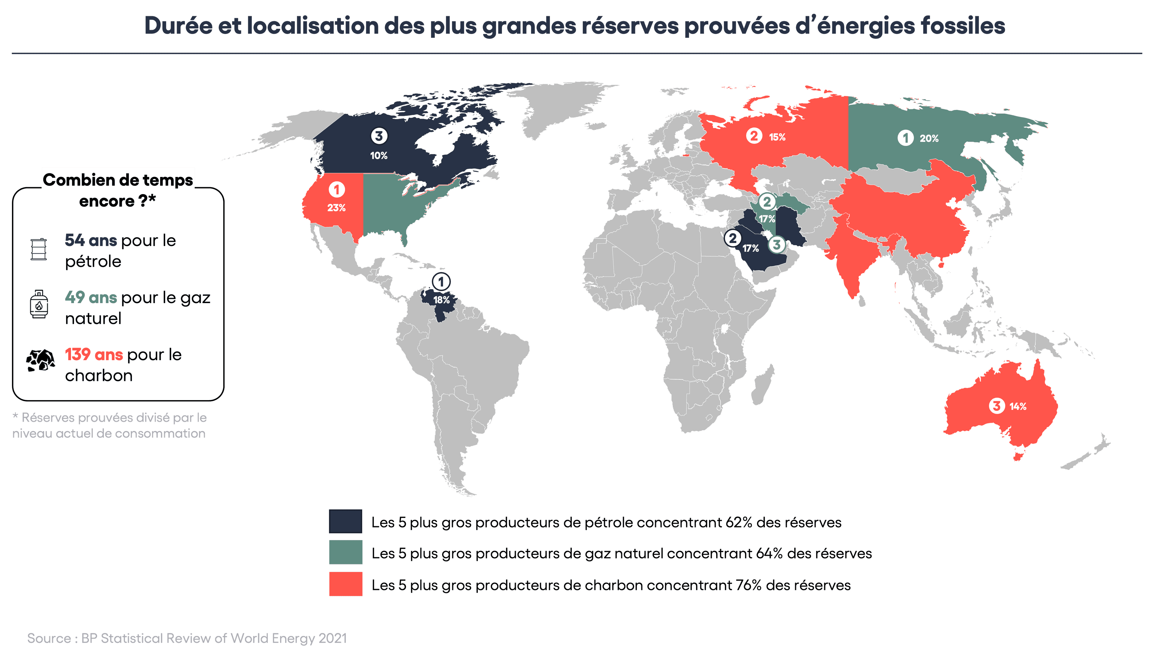 Même s’il y a diverses incertitudes dans l’estimation des réserves[4], posons un ordre de grandeur avec les données de la revue statistique de BP de 2021[3]. Les réserves prouvées d’énergies fossiles seraient d’environ 9 millions de TWh pour le charbon, 3 millions de TWh pour le pétrole et 2 millions de TWh pour le gaz fossile. Au niveau actuel de consommation[5] de chaque énergie, les ressources prouvées permettraient alors de subvenir aux besoins de l’économie extractive pendant 139 ans pour le charbon, 54 ans pour le pétrole et 49 ans pour le gaz fossile. Gardons en tête que ces ressources sont concentrées à plus de 60% dans 5 pays, allant jusqu’à 75% pour le charbon.