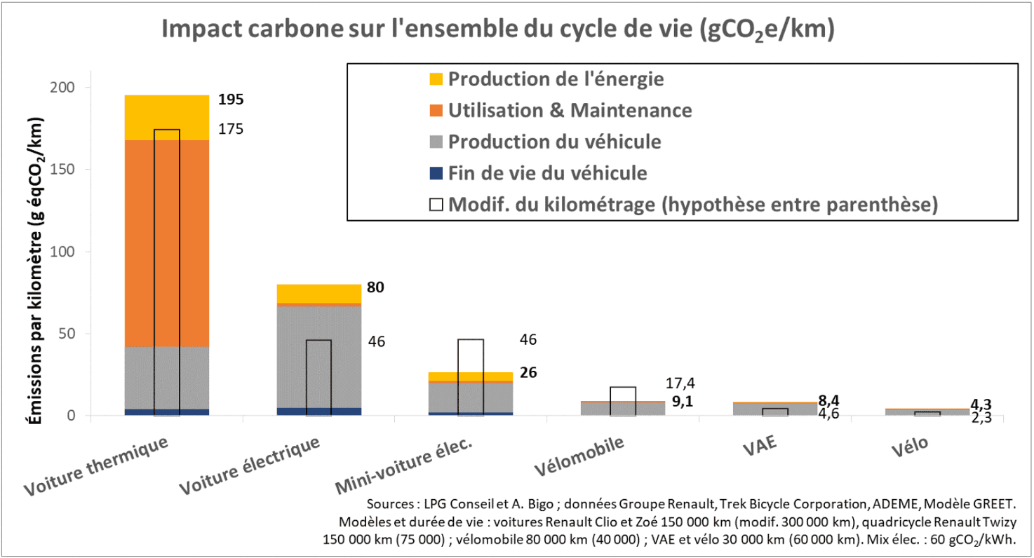 Une voiture électrique en France permet un gain CO2 de 70% par rapport à son équivalent thermique[2]. Néanmoins, d’autres leviers que la simple électrification du parc seront nécessaires pour atteindre la neutralité carbone en 2050, objectif de la France et de l’Europe : la décarbonation de la production des véhicules et de l’électricité, la limitation de la taille des véhicules et des batteries², et plus largement la révision du modèle centré sur la voiture telle qu’elle est définie aujourd’hui. En effet, il existe d’autres moyens de déplacements motorisés adaptés 10 fois moins carbonés qu’une voiture électrique[3].