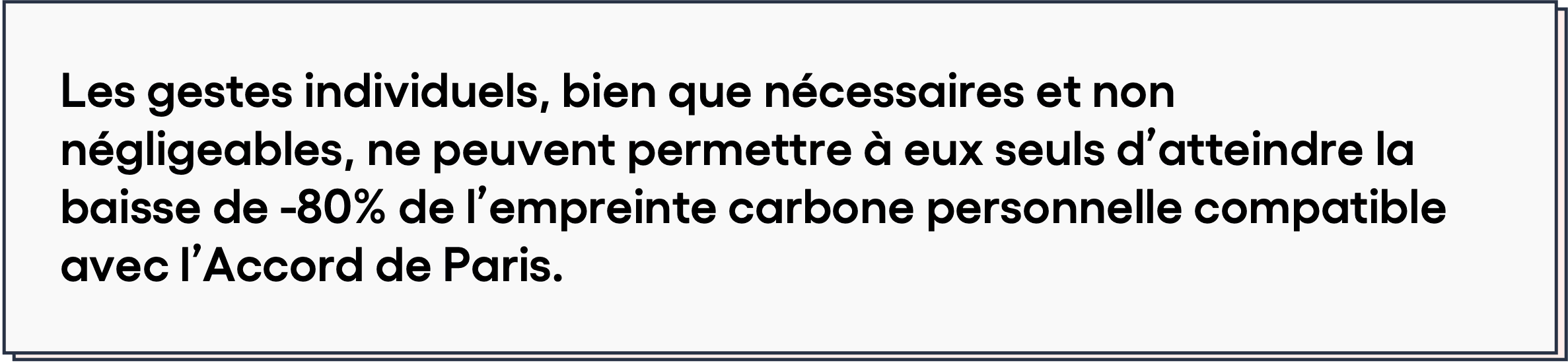 Sachant que la baisse requise pour atteindre des niveaux compatibles 2°C est de l’ordre de -9 tonnes par an et par personne (de 10,8 tCO2/an à 2 tCO2/an), les gestes individuels peuvent donc contribuer au maximum à un peu moins d’un tiers l’effort à faire pour atteindre les objectifs fixés par l’Accord de Paris.