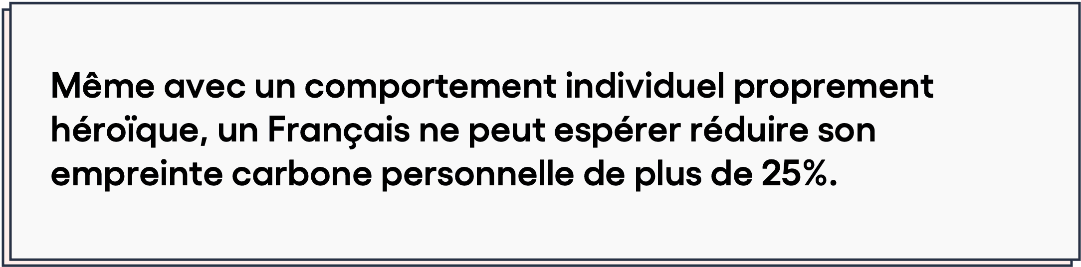 La seconde conclusion est que, même avec un comportement individuel proprement héroïque, c’est-à-dire l’activation quotidienne et sans concession de tous ces leviers, un Français ne peut espérer réduire son empreinte de plus de 2,8 tonnes par an, soit environ 25% de l’empreinte carbone annuelle.