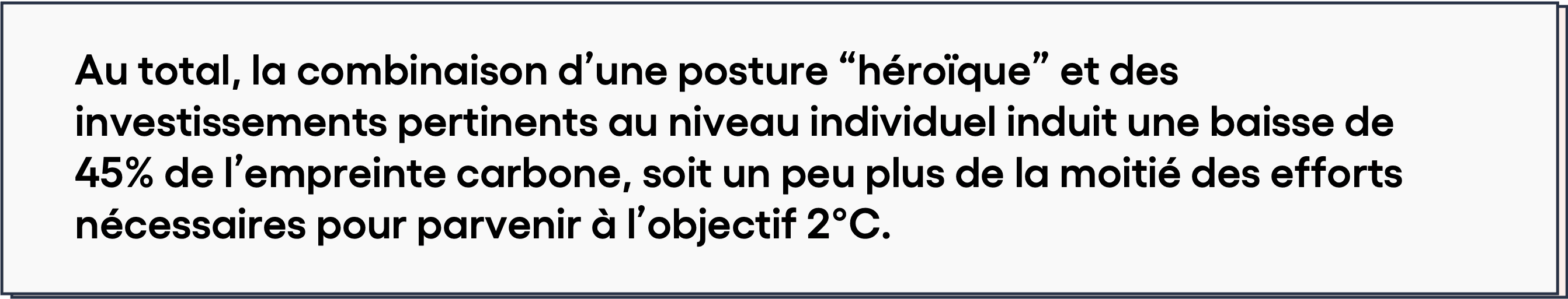 Au total, la combinaison d’une posture “héroïque” et de tous les investissements pertinents au niveau individuel induit une baisse de 45% de l’empreinte carbone, soit un peu plus de la moitié des efforts nécessaires pour parvenir à l’objectif 2°C.