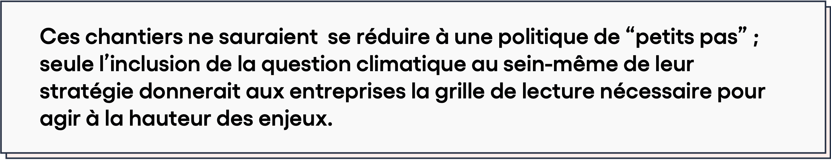 Ces chantiers ne sauraient se réduire à une politique de “petits pas” ; seule l’inclusion de la question du climat au cœur même de leur stratégie, telle que formulée par exemple par le rapport de la TCFD1, leur donnerait la grille de lecture nécessaire pour agir à la hauteur des enjeux. Les acteurs privés ont par ailleurs une responsabilité dans leur capacité à questionner leurs modèles de croissance et d’intégrer les décisions climat au plus haut niveau.