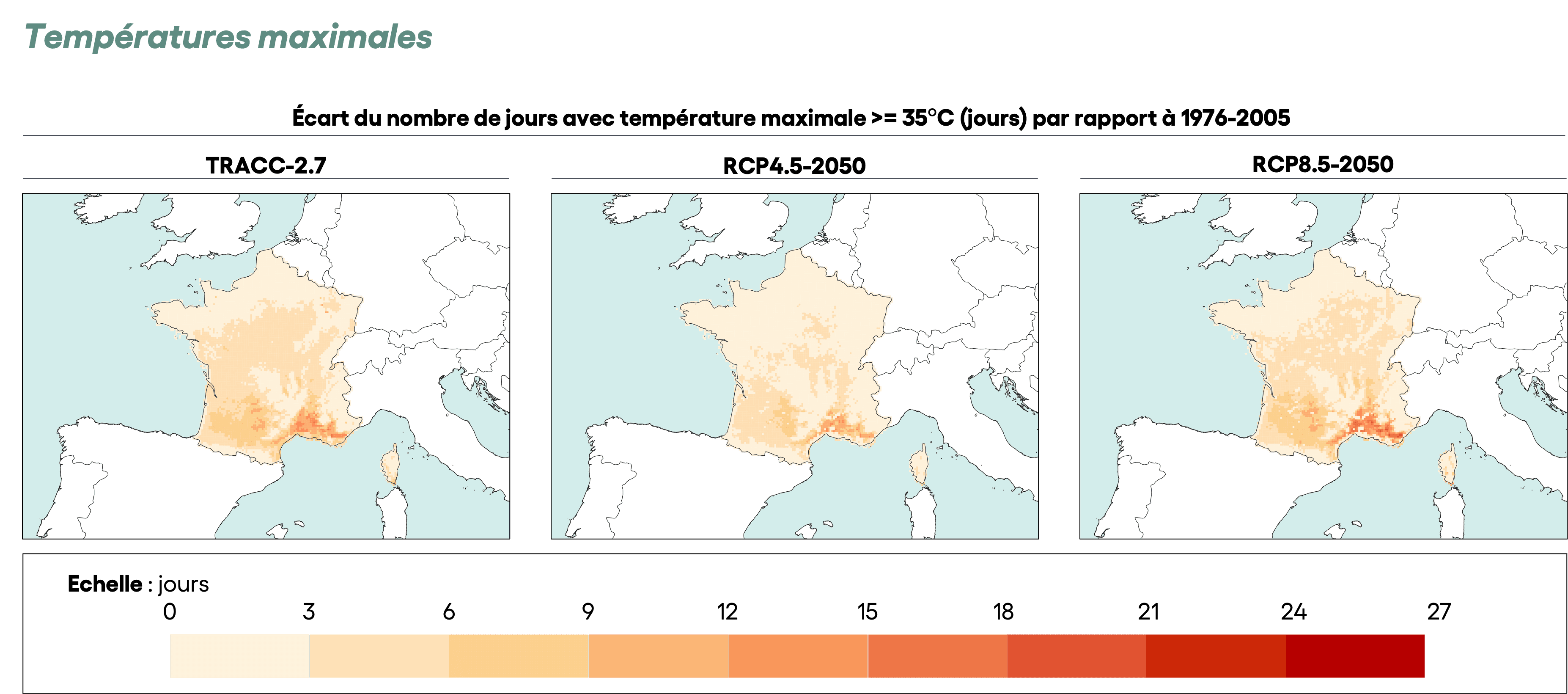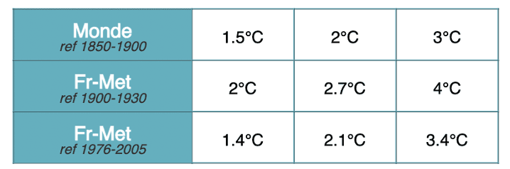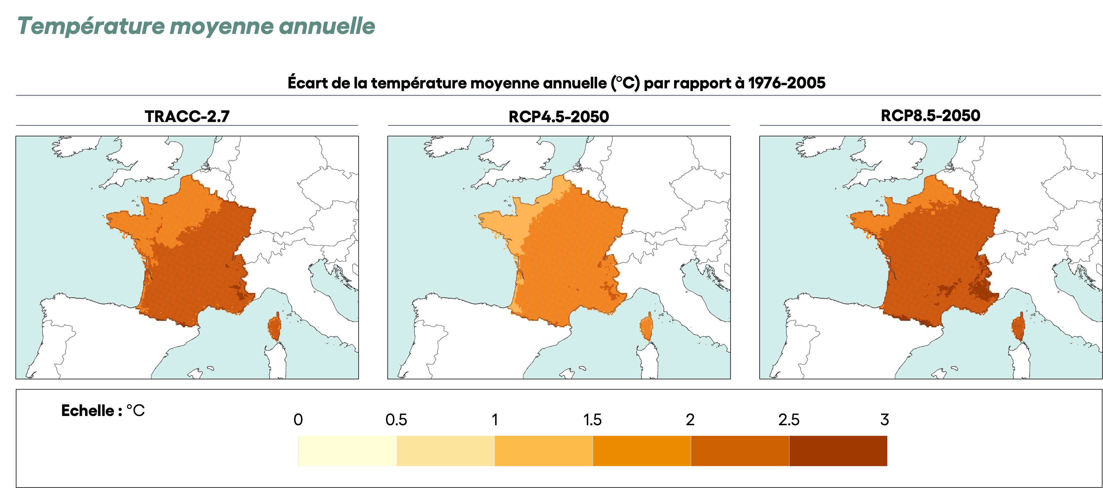 Ces niveaux de réchauffements mondiaux de la TRACC correspondent à une trajectoire de réchauffement de +2°C en 2030, +2.7C° en 2050 et +4°C en 2100 en métropole par rapport à la période 1900-1930.