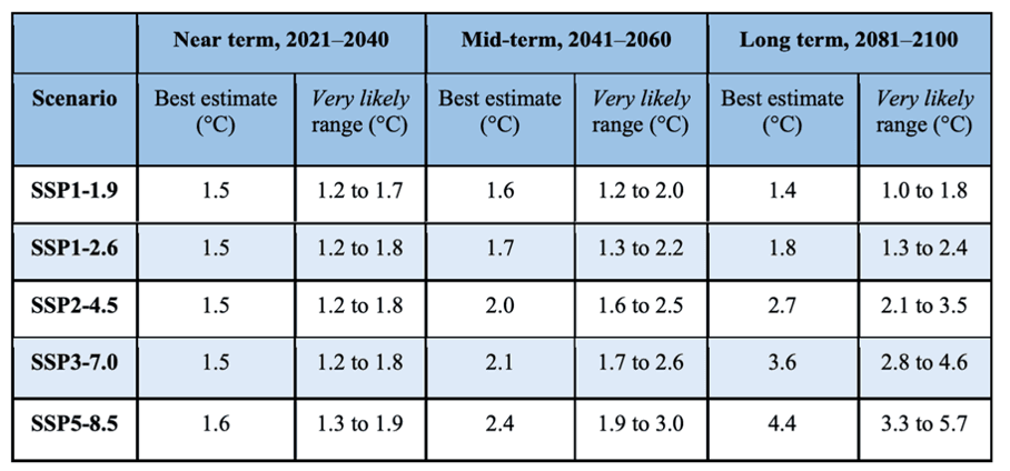 Si l’on compare à présent ces niveaux de réchauffement globaux aux niveaux de réchauffement proposés par le GIEC, il est possible d’identifier les scénarios du GIEC se rapprochant le plus de la TRACC. Selon le tableau suivant, la TRACC devrait être très proche du SSP2-4.5 à horizon 2050 et entre les scénarios SSP2-4.5 et SSP3-7.0 à la fin du siècle.