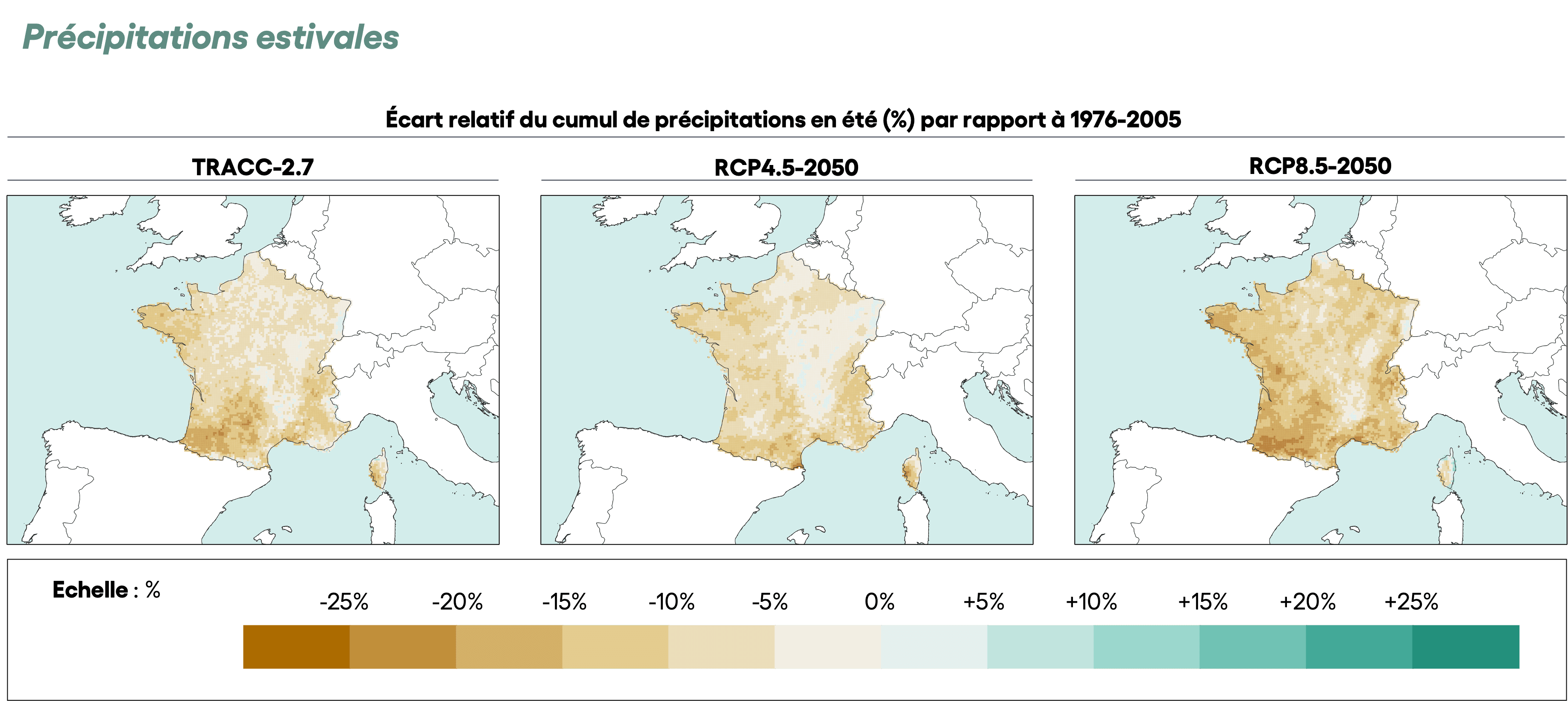 Pour l’écart du cumul de précipitations en été, le scénario RCP8.5 est le scénario projetant la plus forte baisse de précipitations. La TRACC projette une baisse inférieure à celle du RCP8.5 et assez proche de celle du scénario RCP4.5, sauf dans le sud-ouest où l’évolution se rapproche de celle du scénario RCP8.5. Pour environ 3% des points, l’évolution est contraire entre le RCP4.5 et la TRACC, et pour environ 2% des points l’évolution est contraire entre le RCP8.5 et la TRACC.