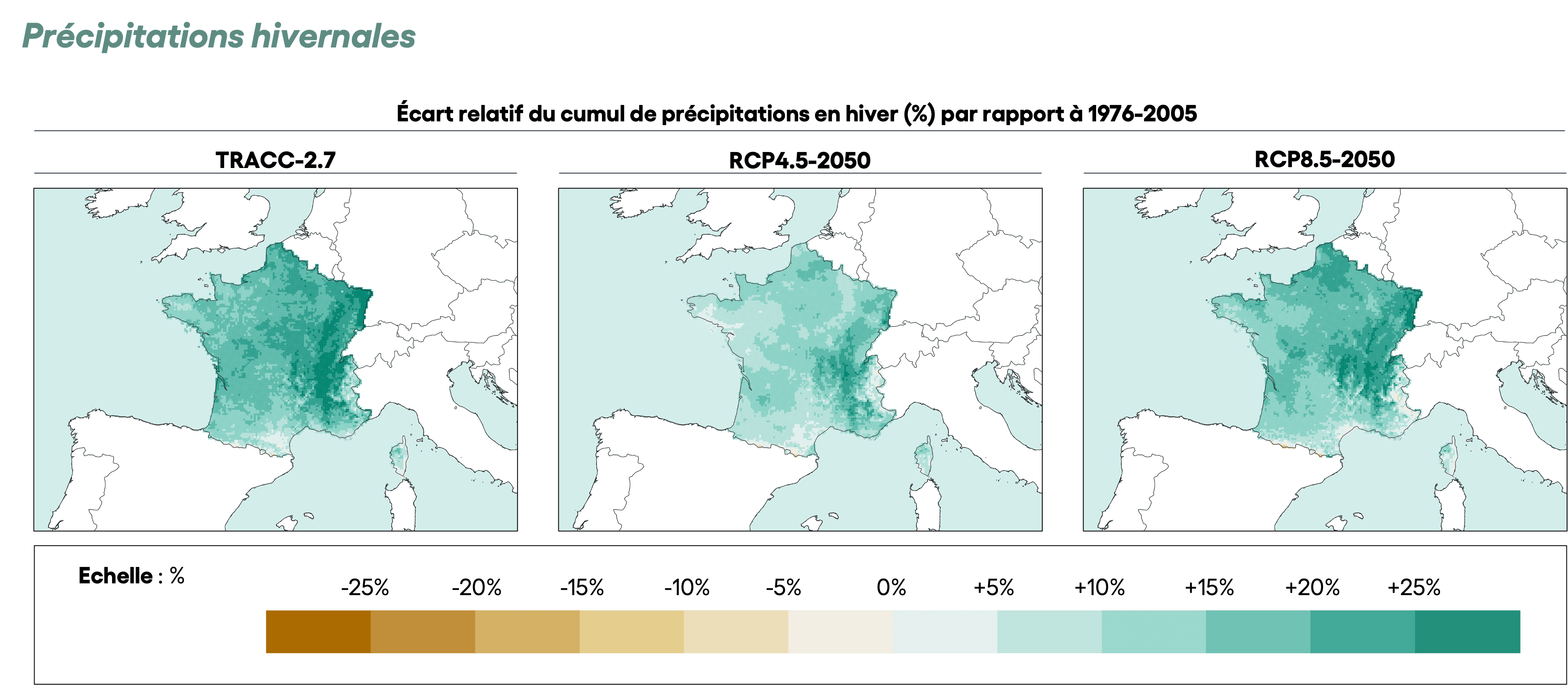 En conclusion, une étude qui a été faite pour le scénario RCP 8.5 à l’horizon 2050 permet bien de couvrir les évolutions projetées par la TRACC pour un réchauffement de 2.7°C, sauf pour le cumul de précipitations hivernales, où la TRACC pourrait projeter une évolution encore plus défavorable que celle projetée par les scénarios RCP8.5. Au contraire, une étude réalisée avec le scénario RCP 4.5 serait elle plutôt minorante par rapport aux projections de la TRACC.