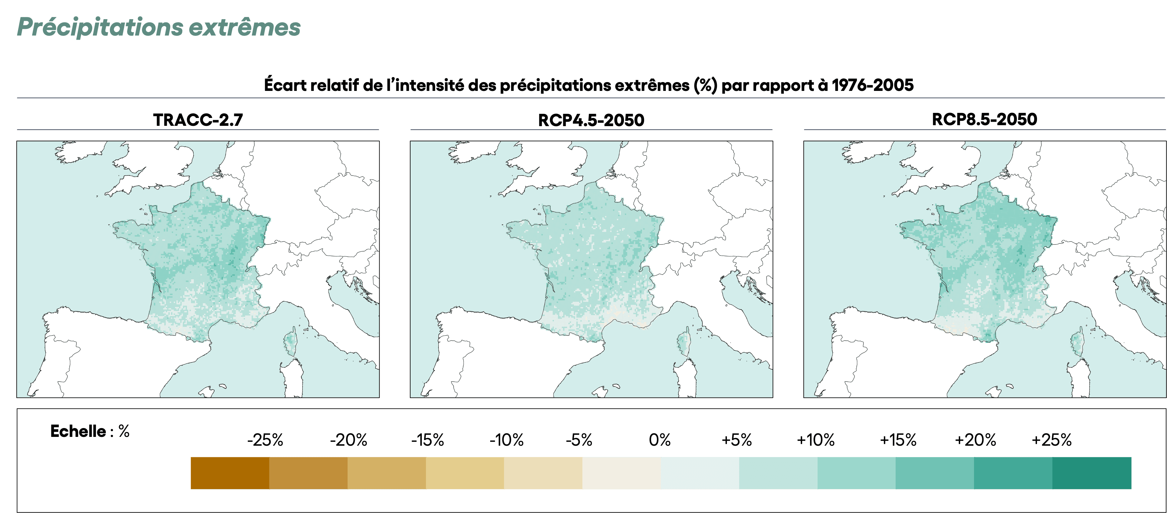 Pour les précipitations, la comparaison est moins aisée puisque les projections peuvent être de sens contraire. Le scénario RCP8.5 projette le plus d’assèchement en été, et le scénario TRACC est semblable au scénario RCP4.5. Pour le cumul de précipitations hivernales, la TRACC a les projections les plus importantes. Les projections des scénarios RCP8.5 et de la TRACC pour les précipitations extrêmes sont semblables.