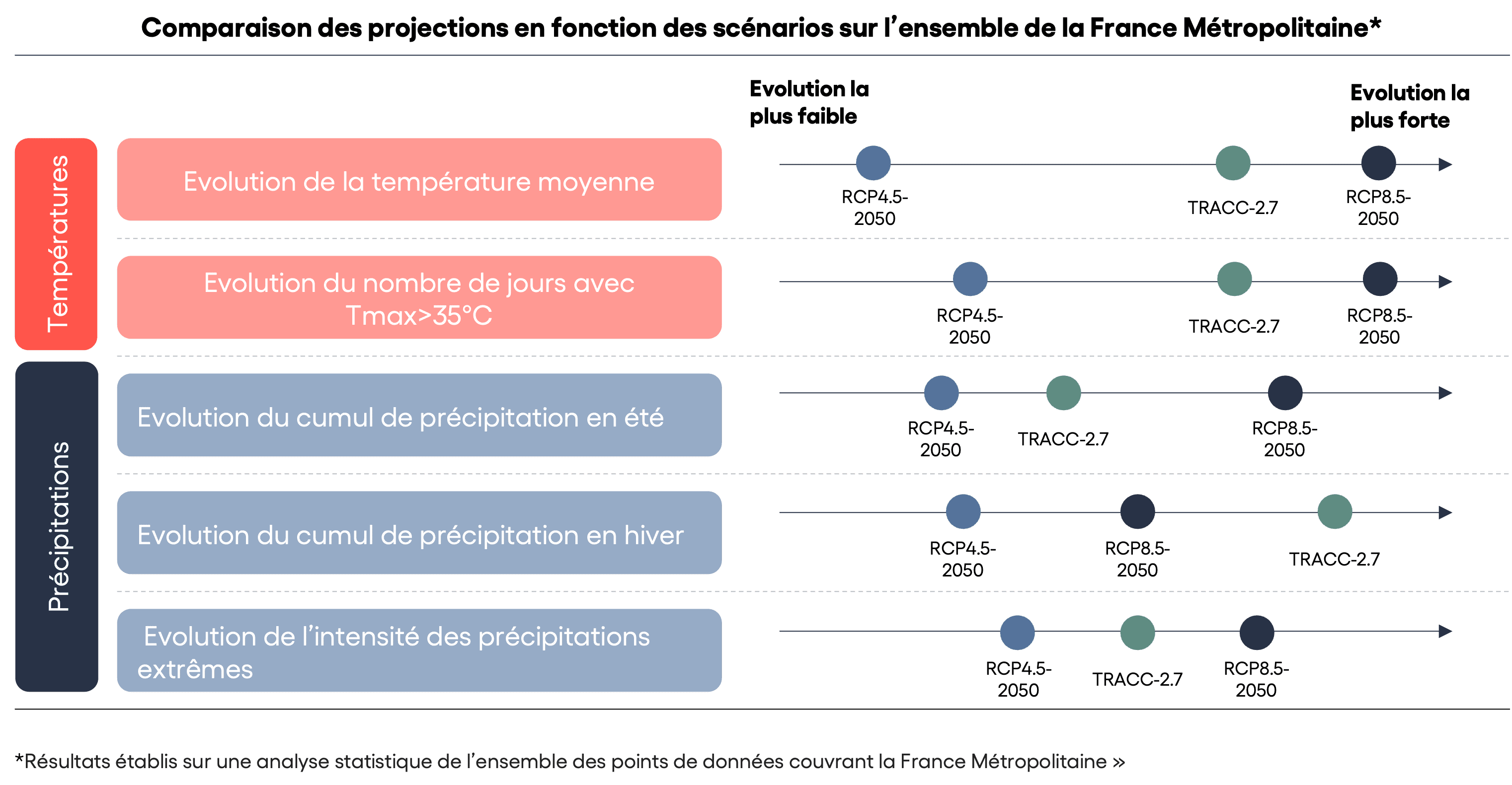 Étant donné l’attention croissante des acteurs économiques pour l’adaptation et donc pour ces jeux de données climatiques, nous avons souhaité comparer les deux jeux de données de référence disponibles pour la métropole : DRIAS2020 et TRACC. L’objectif de cette comparaison est de comprendre si le choix d’un jeu de données plutôt qu’un autre pourrait avoir un impact sur les risques physiques identifiés, et si les entreprises qui auraient déjà analysé leurs risques avec les données « DRIAS-2020 » devraient mettre à jour leur analyse avec ces nouvelles données.