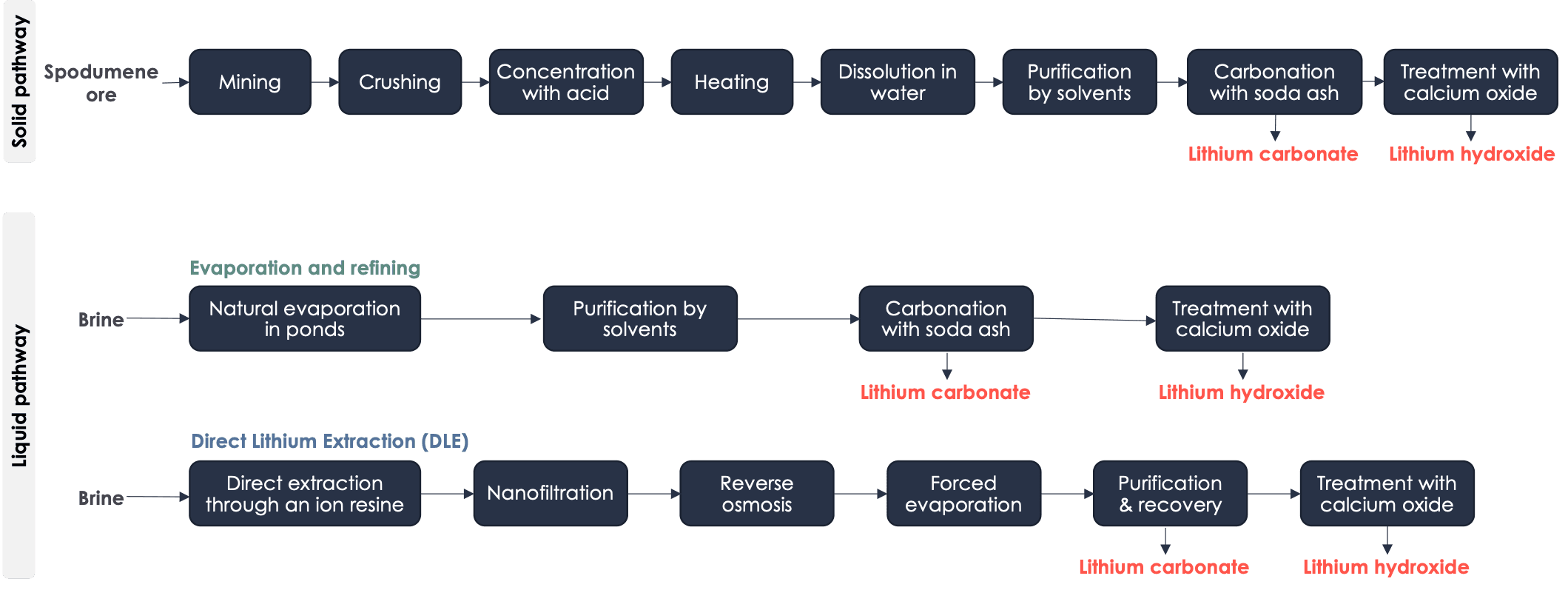 ▶️ Lithium : There are two main production pathways for battery-grade lithium.