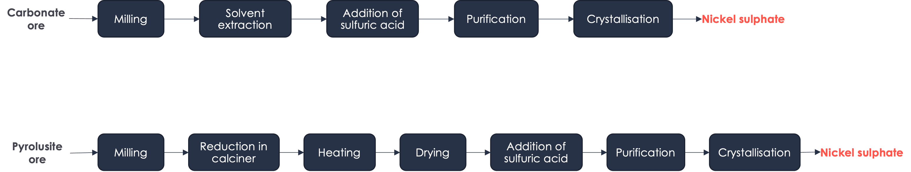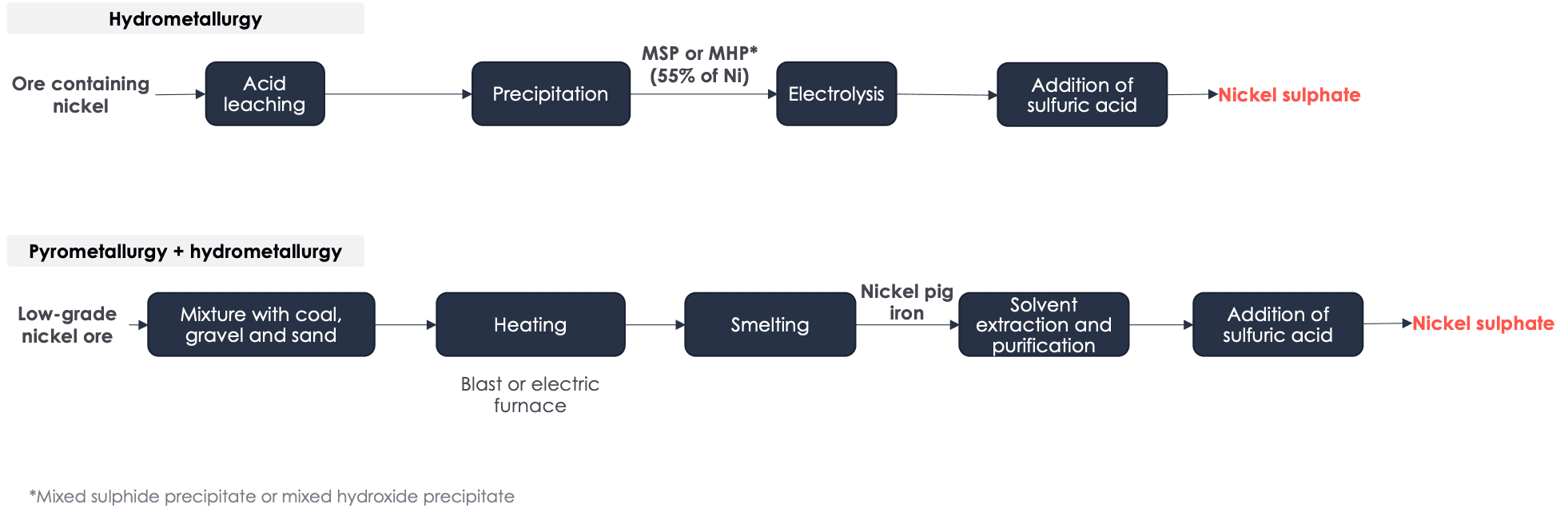 ▶️ Battery-grade nickel is produced from nickel sulphate. Nickel sulphate can be produced by hydrometallurgy alone, by a High Pressure Acid Leaching and Base Metal Refinery (HPAL + BMR) process or by pyrometallurgy followed by hydrometallurgy (”pig iron” pathway).