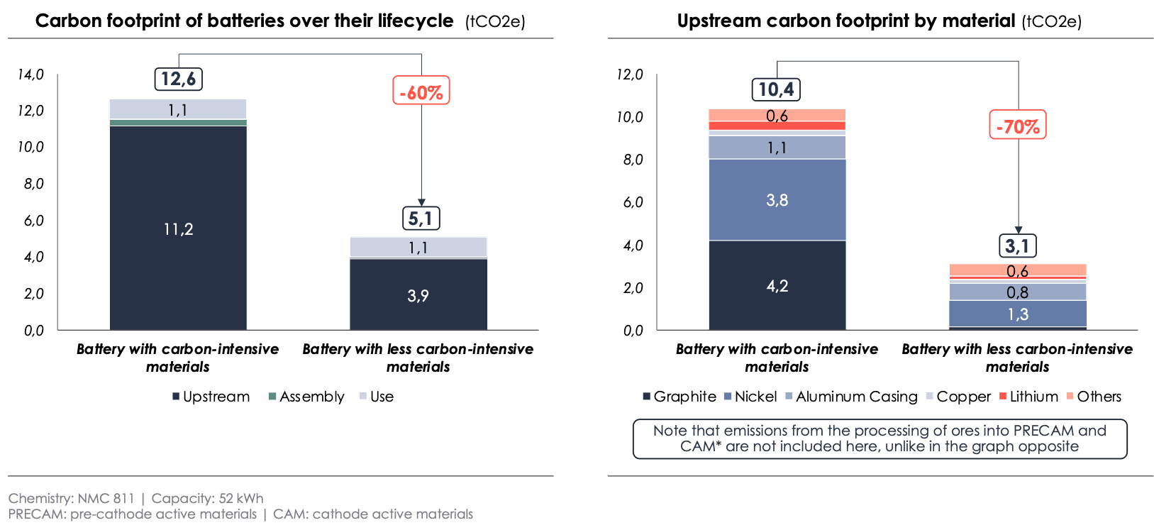 The gap in carbon footprint over the lifetime between the battery with carbon-intensive materials and the one with less carbon-intensive materials is 60%. This is mainly due to the upstream materials (+70%) and the assembly (+70%) (see chart below). Within upstream materials, the largest differences in carbon intensity are observed for graphite (x30) and nickel (x3), which is consistent with the improvements to the model explained in Part III.