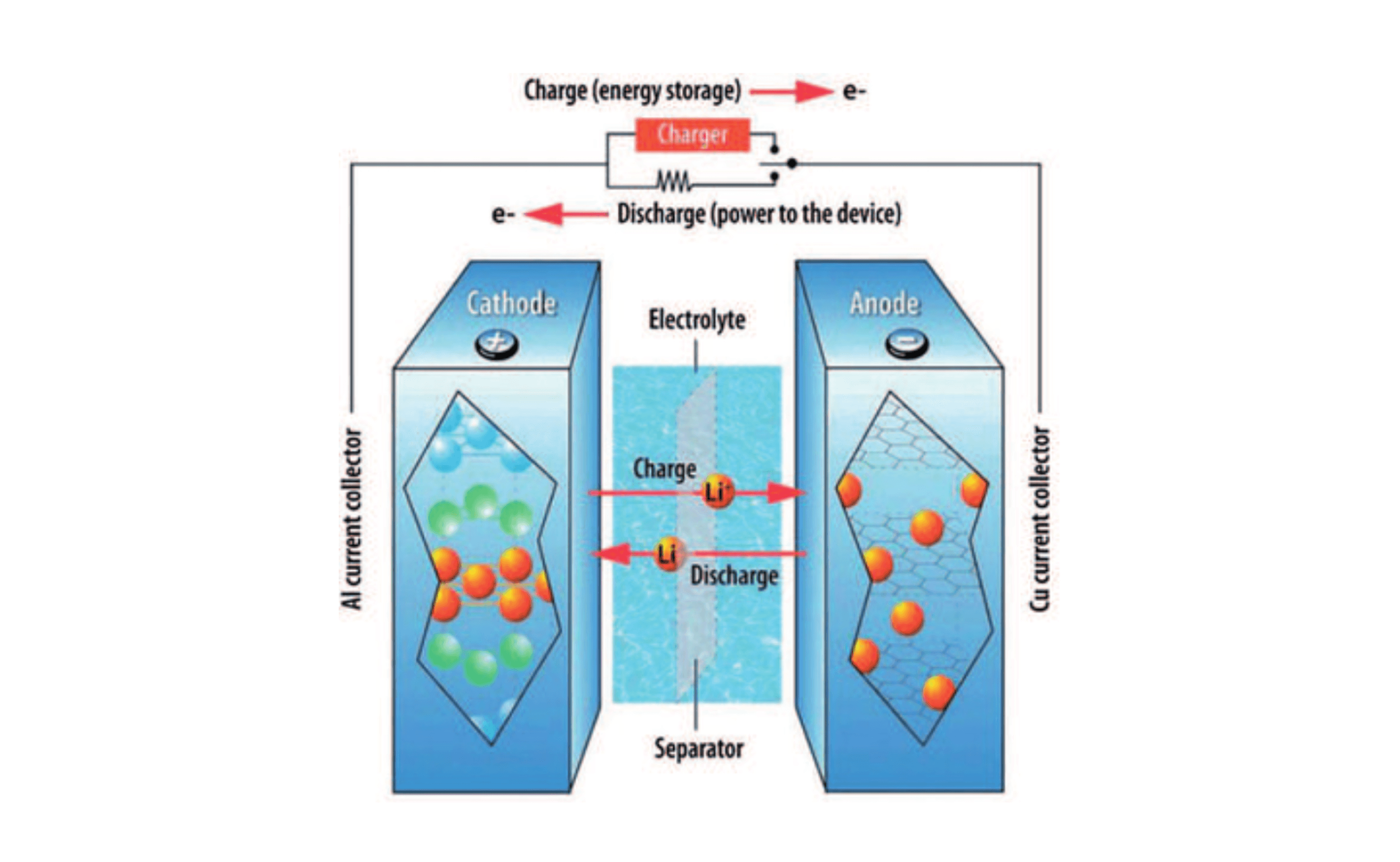 A battery cell consists of 4 parts : a cathode (positive electrode) and an anode (negative electrode) immersed in an electrolyte (an ionic conductive liquid) and separated by a separator (see diagram below). During the operating phase, the potential difference between the anode and the cathode causes ions to circulate inside the electrolyte and creates an electric current. Conversely, during the recharging phase, the energy transmitted by the charger causes electrons to flow back from the positive to the negative electrode, and the lithium ions flow to the negative electrode to balance the electrical charges.