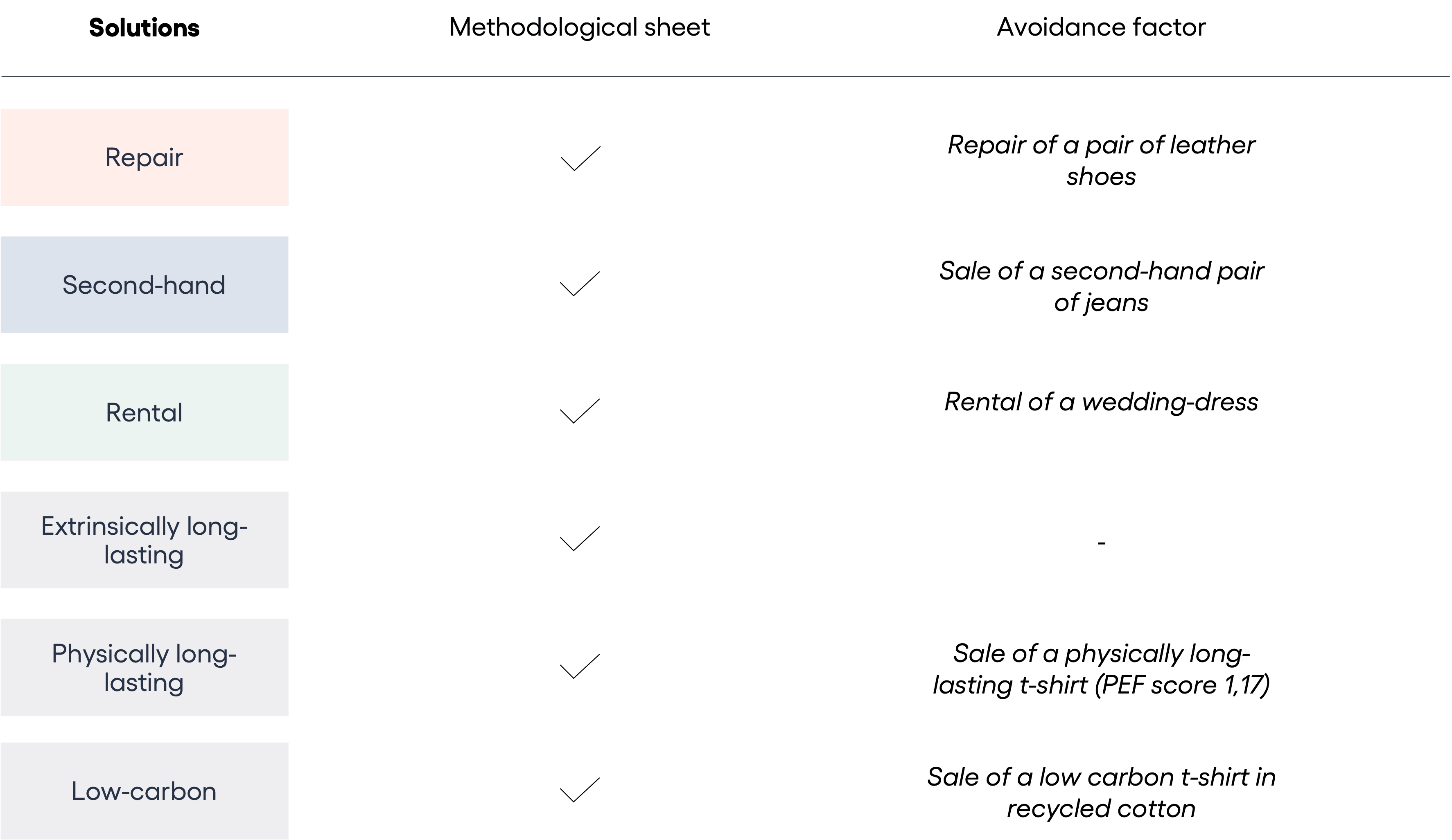 This toolbox centralizes methodological results for the Apparel and Footwear sector and provides sector-specific methodological guidelines on avoided emissions, for each solution/context pairing. For certain solutions, the toolbox also provides detailed methodology sheets and a first estimation of avoidance factors (AFs) for a specific combination of solution and context.