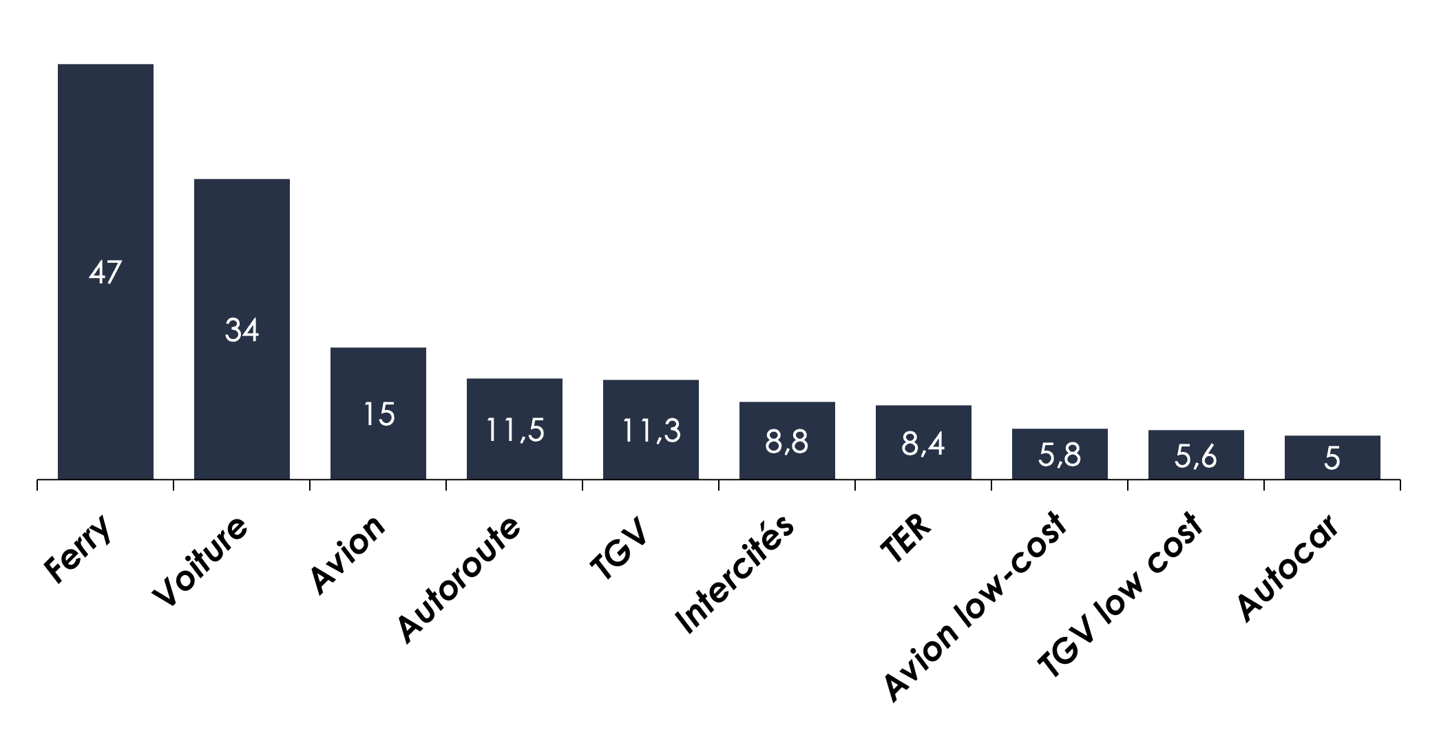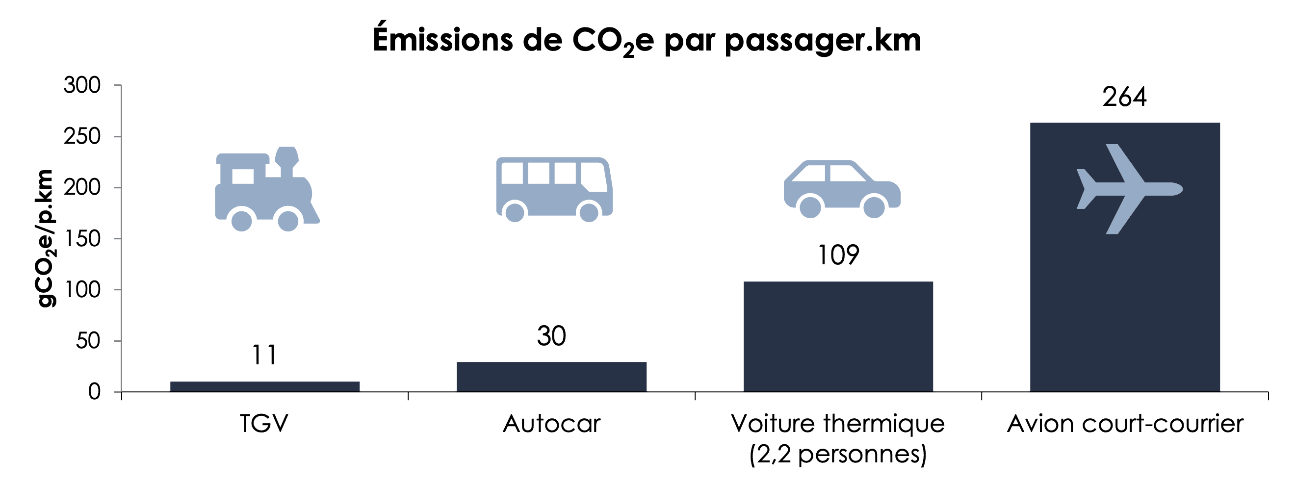 Habituellement, pour comparer les émissions de CO2 des modes de transport, on calcule les émissions en CO2/p.km, c’est-à-dire la quantité de CO2 émise pour transporter une personne sur 1 km. En utilisant cette méthode, le train se démarque en tant que mode de transport bas carbone. Sur la longue distance, ce qui correspond aux trajets réalisés pour les vacances, l’avion est le plus émissif. On remarque également que la voiture reste un mode de transport très émissif.