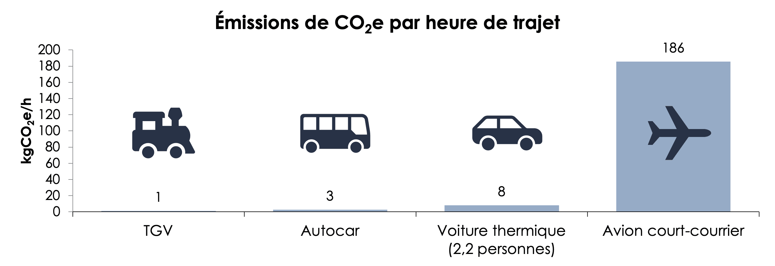 Cependant, avec un temps dédié aux vacances défini (un week-end, une semaine, deux semaines, etc.), le choix de la destination se fait en fonction de la durée du trajet pour l’atteindre. En effet, une personne prête à faire 4h de trajet pour partir en vacances n’émettra pas autant selon qu’elle prend le TGV pour se déplacer en France, ou l’avion pour rejoindre une destination plus lointaine. Le temps de trajet apparaît alors, avec bien sûr le coût, comme le véritable critère de choix plus que la distance parcourue. Il est donc intéressant de s’intéresser aux émissions de CO2 pour une heure de trajet. On remarque alors que l’avion se démarque très nettement comme le mode de transport le plus émissif par heure de trajet. Le train reste le mode de transport le moins carboné dans cette approche. Le problème de l’avion ne sont donc pas tant ses émissions par kilomètre, mais bien le fait qu’il favorise des trajets sur des distances qui ne seraient pas envisagées sinon !