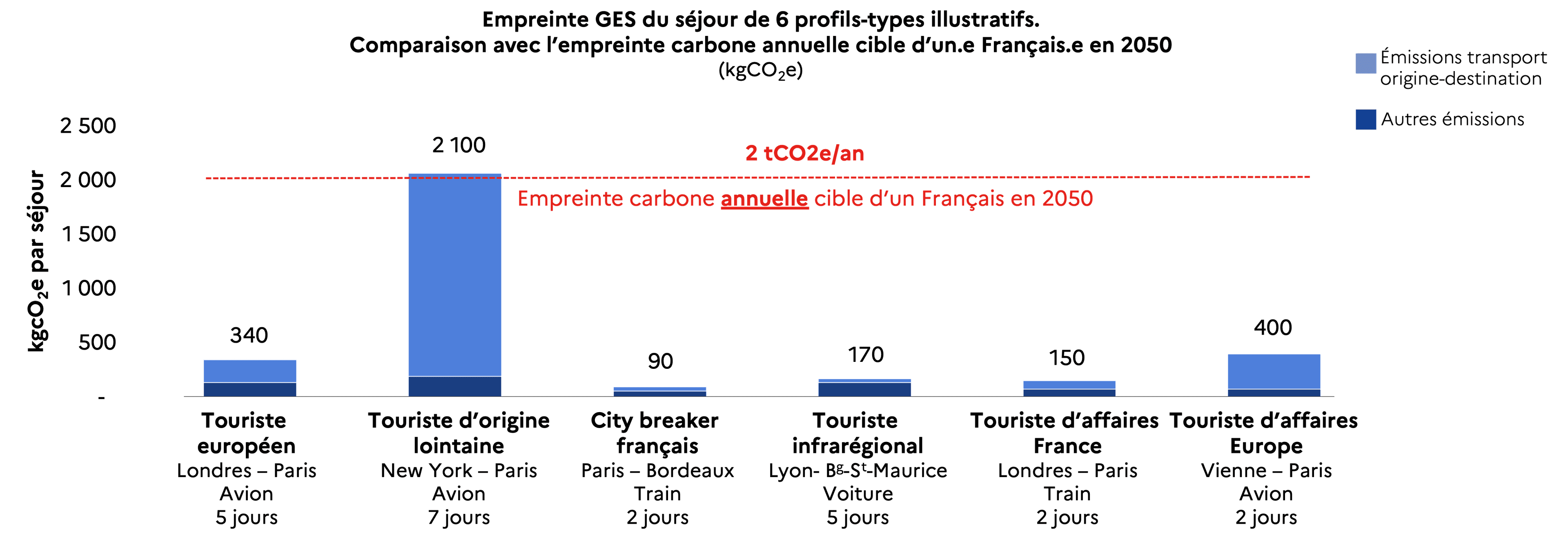 Comme mentionné dans notre première FAQ, le transport représente la majeure partie des émissions carbone du tourisme. Cela se retrouve d’ailleurs dans les émissions de quelques profils types :