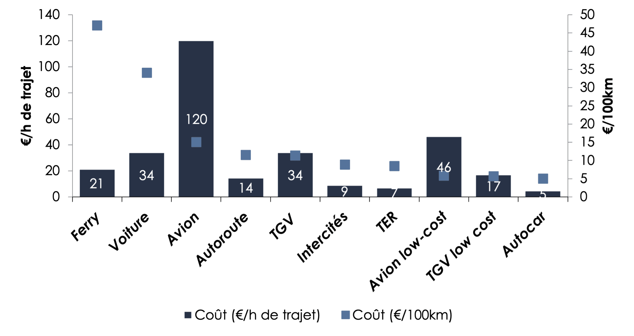 Néanmoins, cette analyse cache une partie de la vérité, puisque le prix augmente généralement avec la distance. Or, les voyages bas carbone favorisent les destinations plus proches, comme expliqué en question 7, plus que la distance, la durée du trajet détermine généralement le choix des vacances. Si l’on ramène le coût du voyage par heure de trajet, on obtient une meilleure corrélation avec les émissions, avec un coût du transport aérien très élevé, et un transport ferroviaire (hors TGV) ou en autocar moins cher que le transport routier, même si le TGV reste onéreux (voir figure suivante).